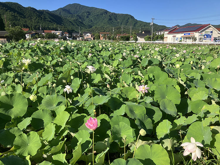 訪問当日のハス園の様子。花密度はさほど高くはありませんでしたが、沢山の花が咲いていました。鹿野町内の休耕田に植えられているので、周りには民家などがあります。画面右側は赤い屋根の電気屋さん。遠景を背景にすると民家が避けられないので、逆に電気屋さんをアクセントにした写真を沢山撮りました。