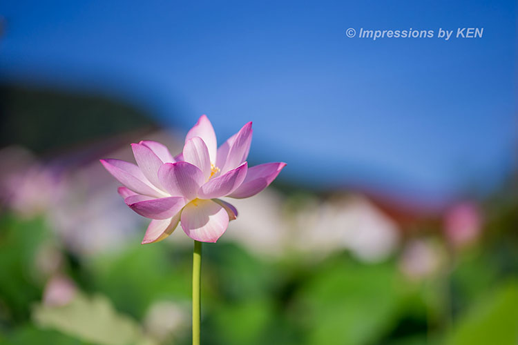 青空を背景に、爽やかな感じで。これも日陰に咲いていた花なので、青空との輝度差が大きく、空の青さが出ませんでした。でも蓮が柔らかく表現されており、写真としてはそれで良いと思ってます。