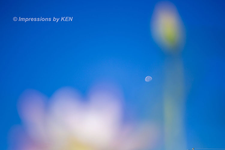 空には月が綺麗に出ていたので、ハス園らしい構図で一枚。