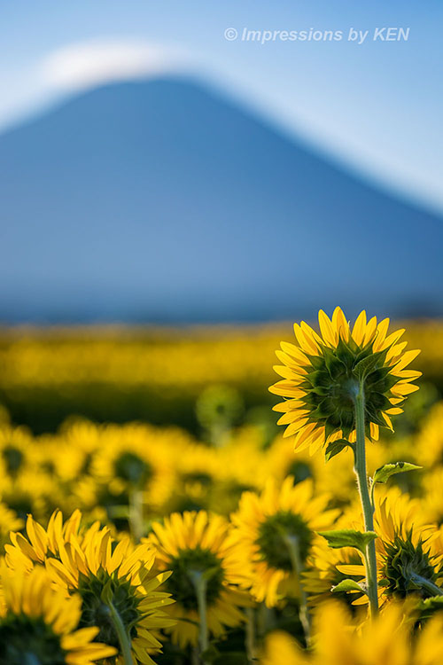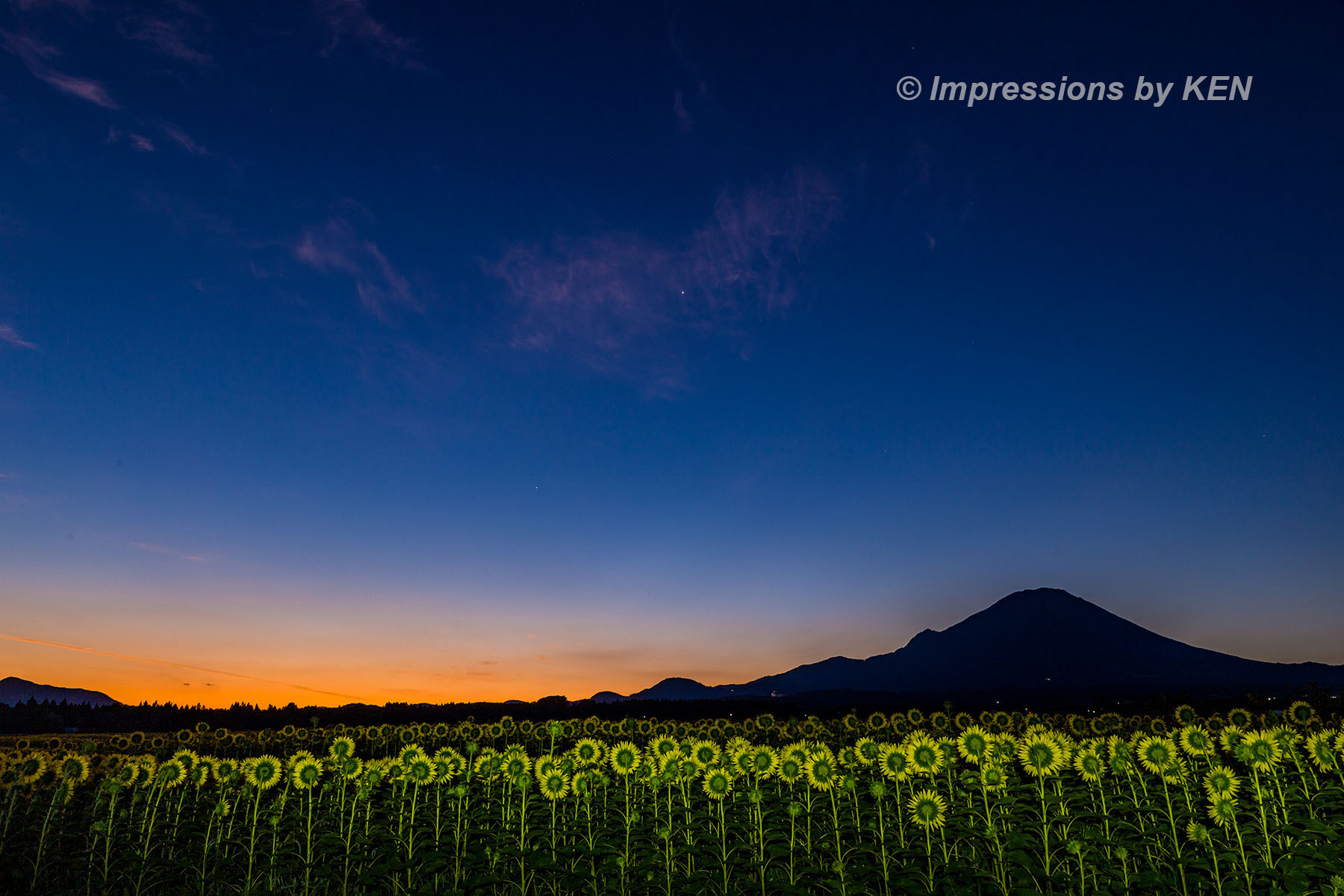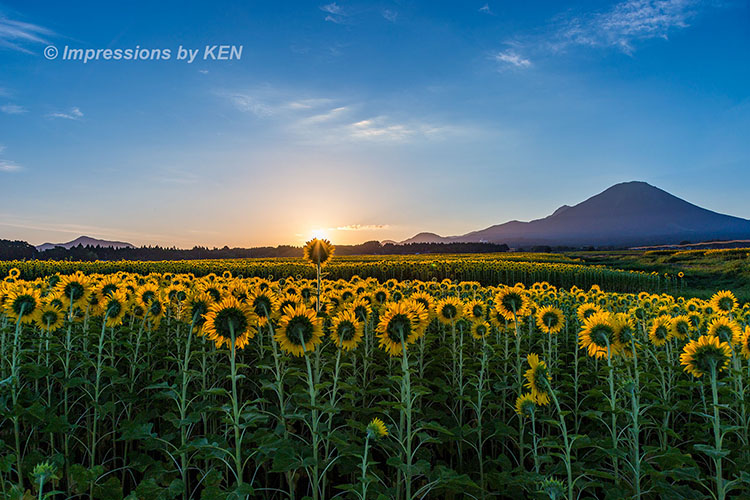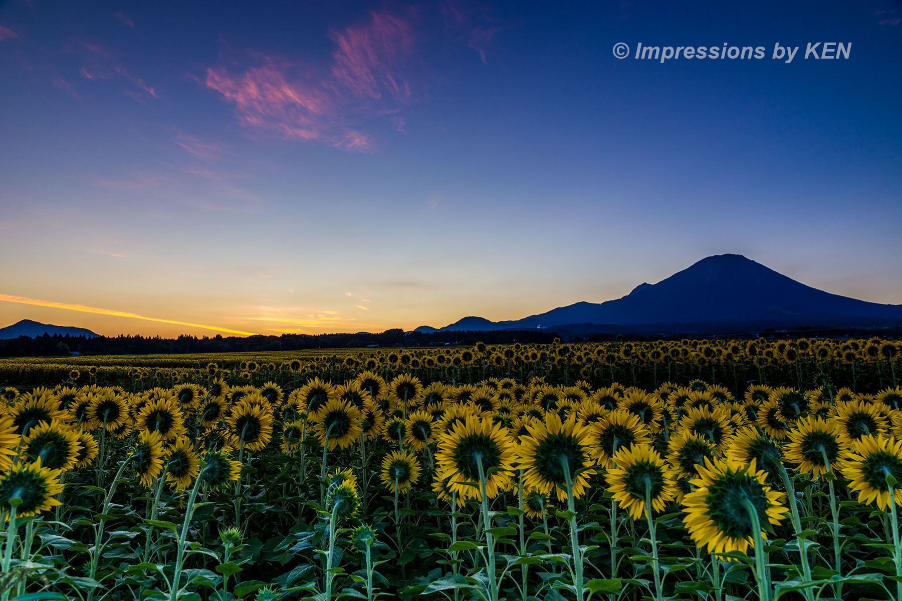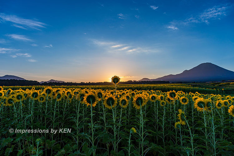 改めて大山を入れて日の出を。既に太陽が顔を出しているので、ヒマワリで隠して日の出らしさを出しました。