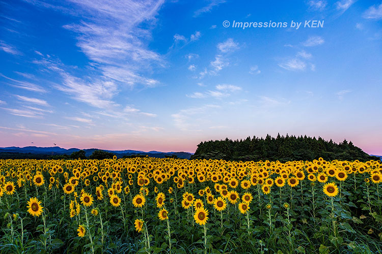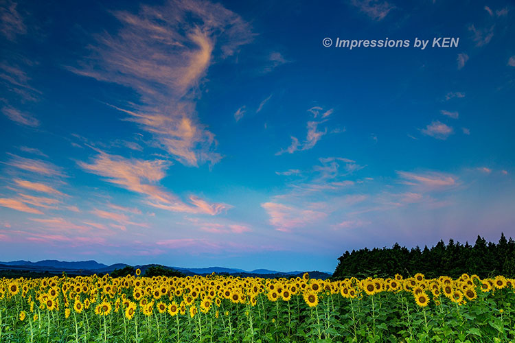 向きを変えて、満開のヒマワリを真正面から。西の空を写していますが、朝焼けが西にまで及び、美しい情景になりました。