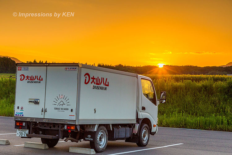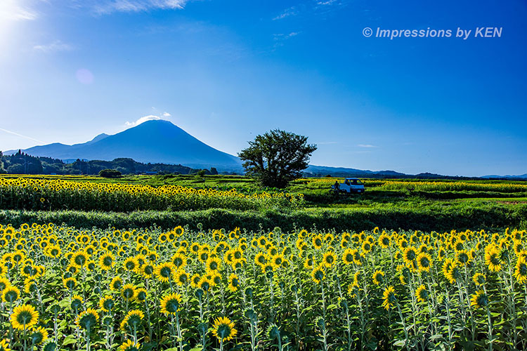 広大なヒマワリ畑と名峰大山。軽トラが居てくれたので、モデルになって貰いました。