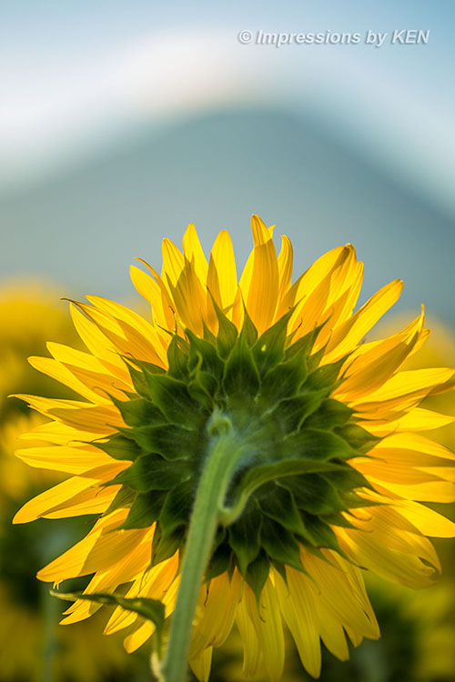 ここからはマクロレンズで。バックシャンなヒマワリと大山。