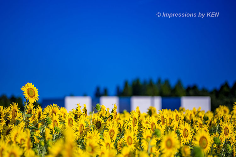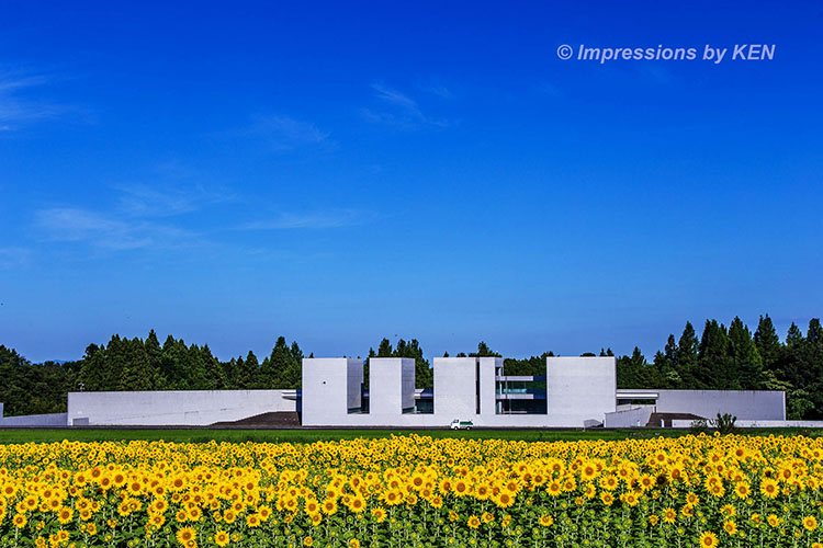 植田正治写真美術館の特徴的な建物と共に、満開のヒマワリ。