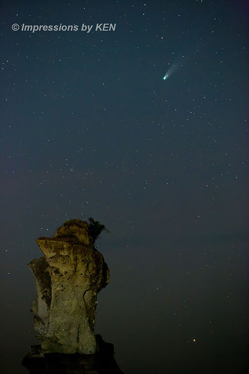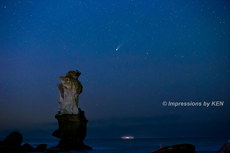 船が通りかかったので、広角側(70mm)で撮影。強調現像していないので彗星の尾が余り目立ちませんが、じっと見ていると画面上端にまで伸びる長い尾が何となく見えてきますよ。