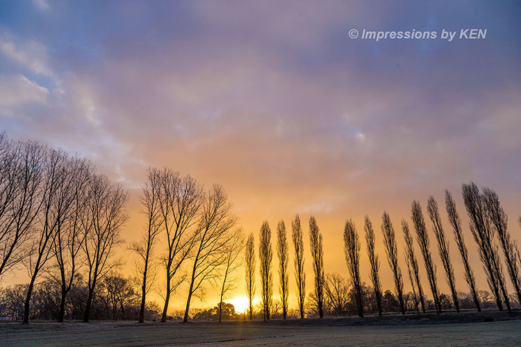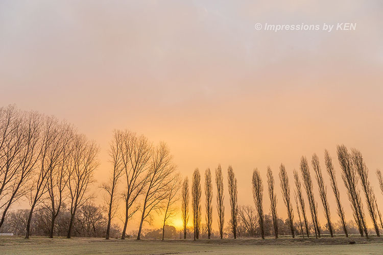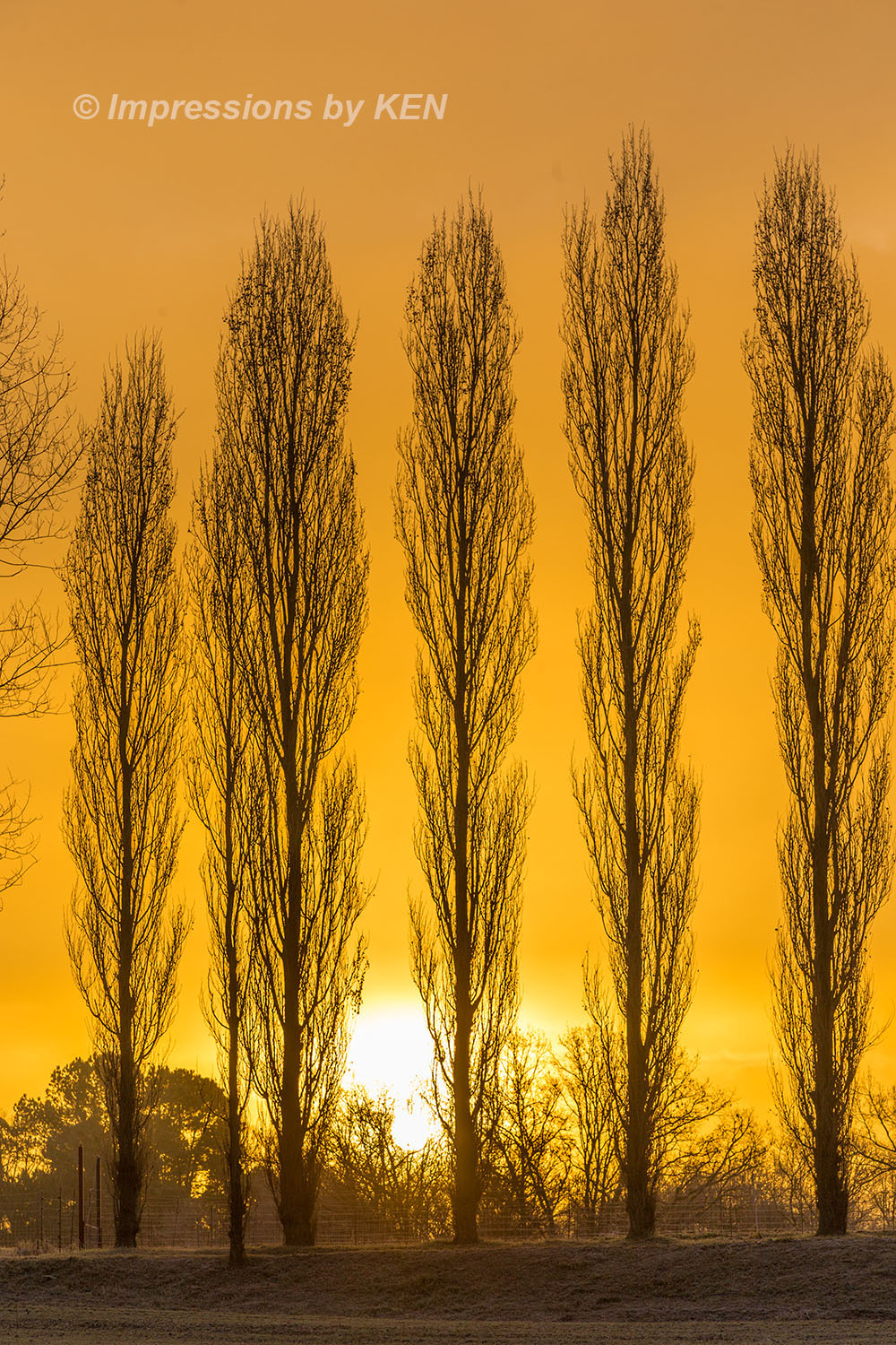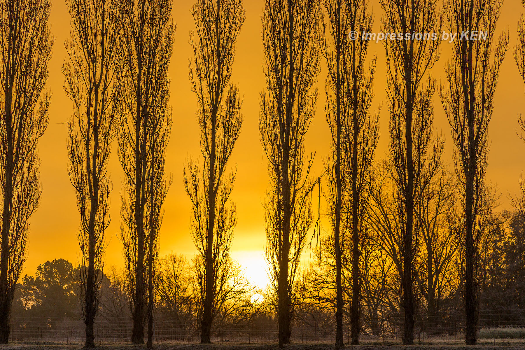 日の出が近づき、オレンジ色に包まれるポプラ並木。