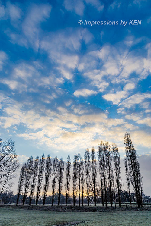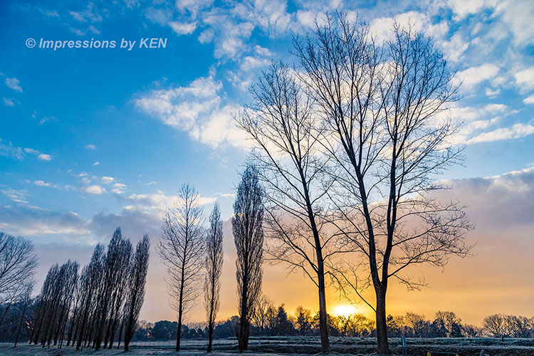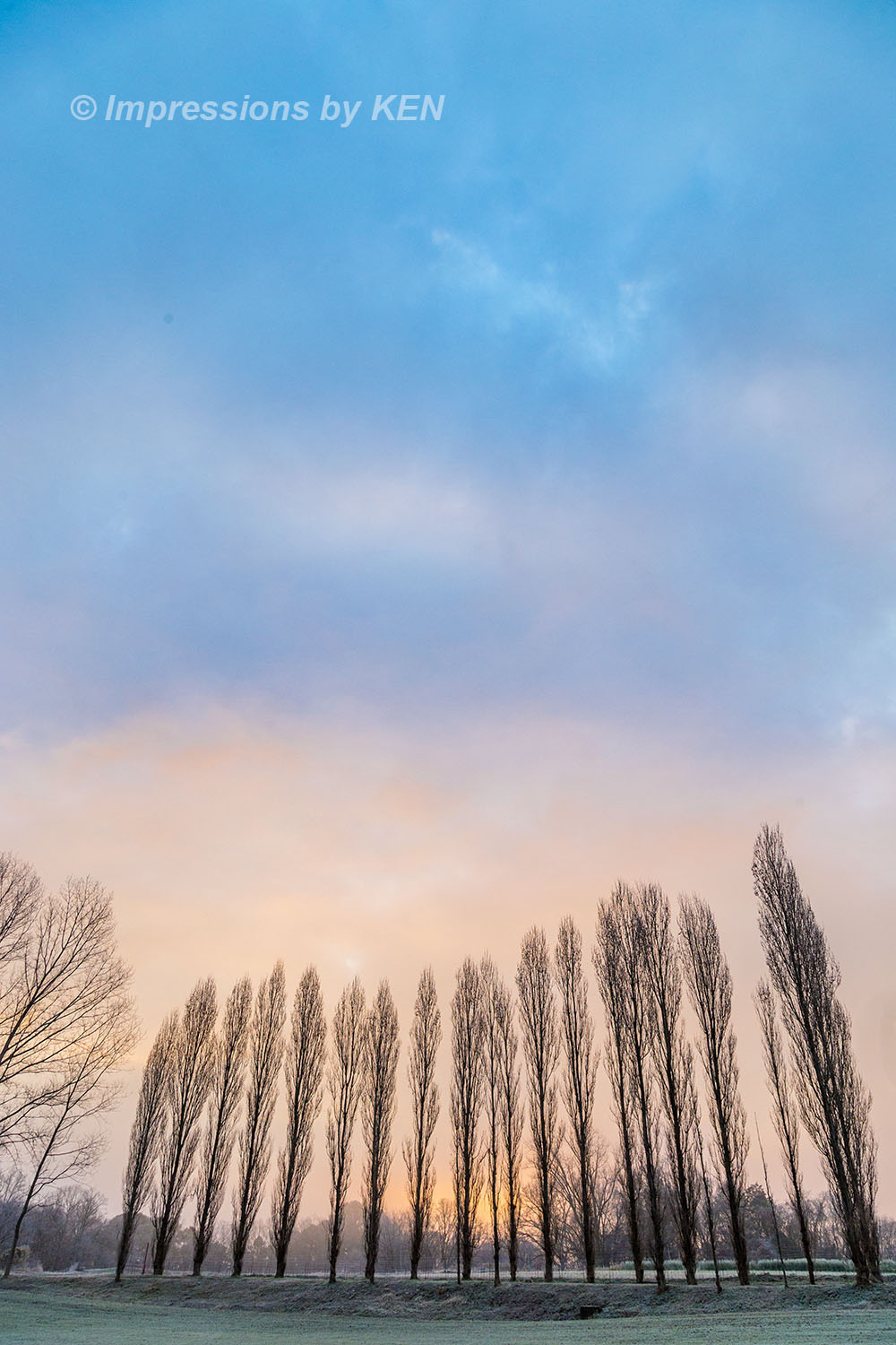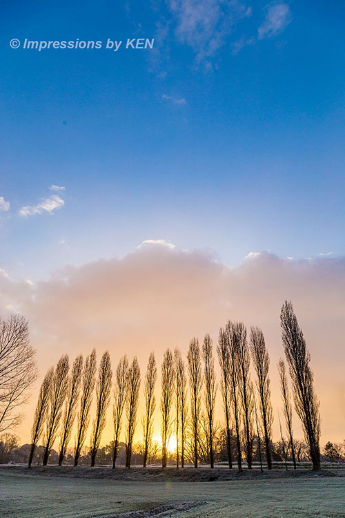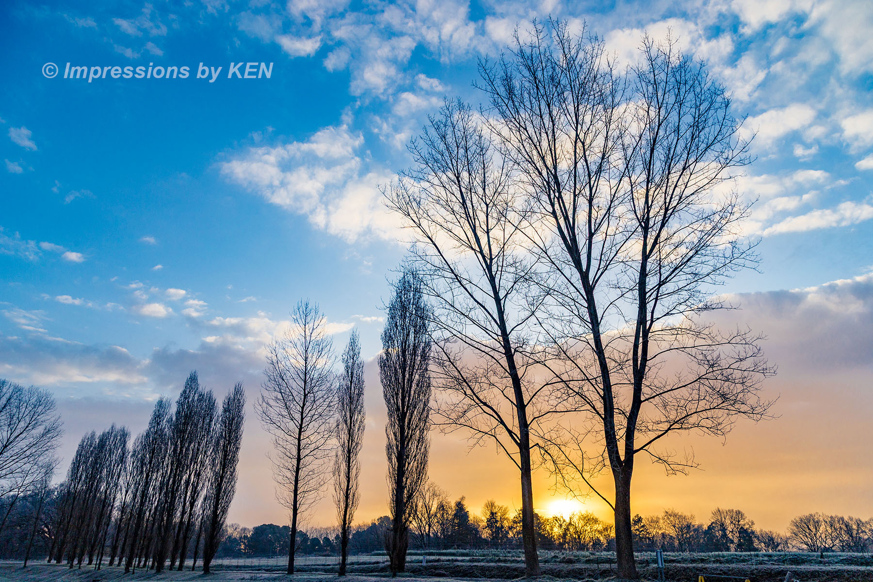 日の出が近づき、オレンジ色に包まれるポプラ並木。