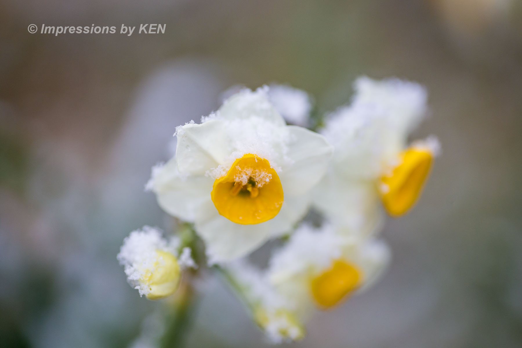 足元に咲いていたスイセンにも雪が降り掛かり、寒そうです。