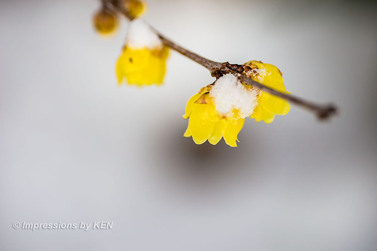 花の上に雪が残る枝を主役に、背景を注意深く配置して、、