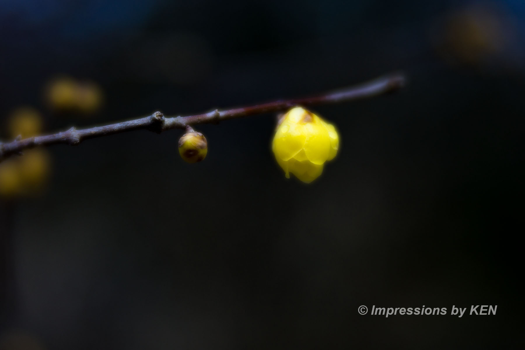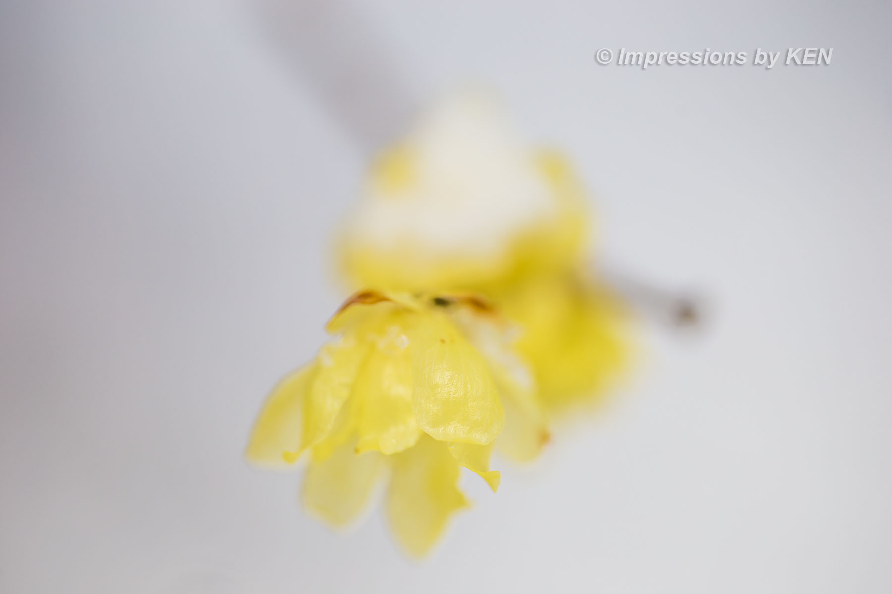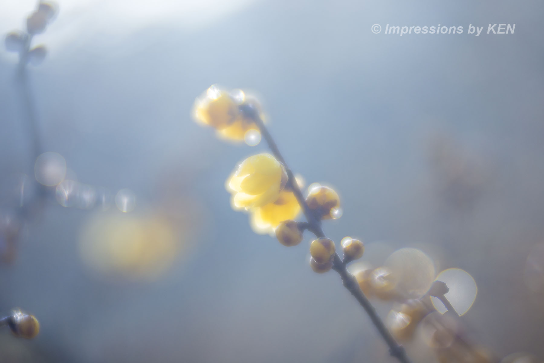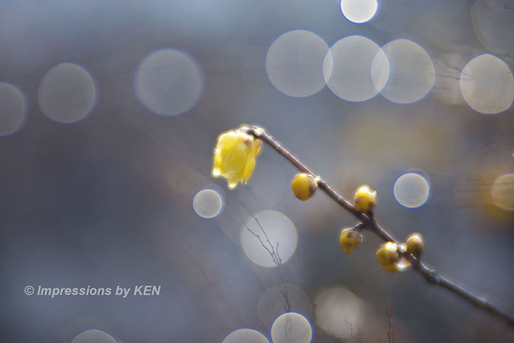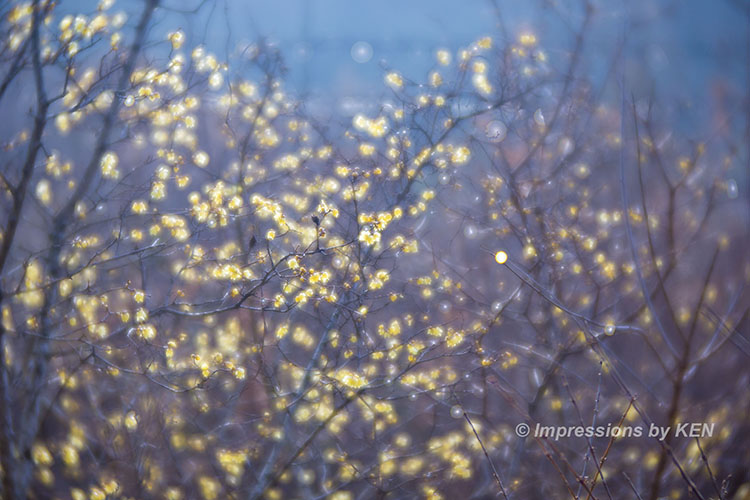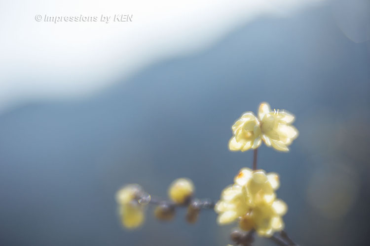 ド逆光でベールに包まれた淡い空間に咲くロウバイ。