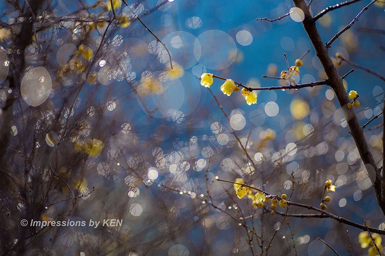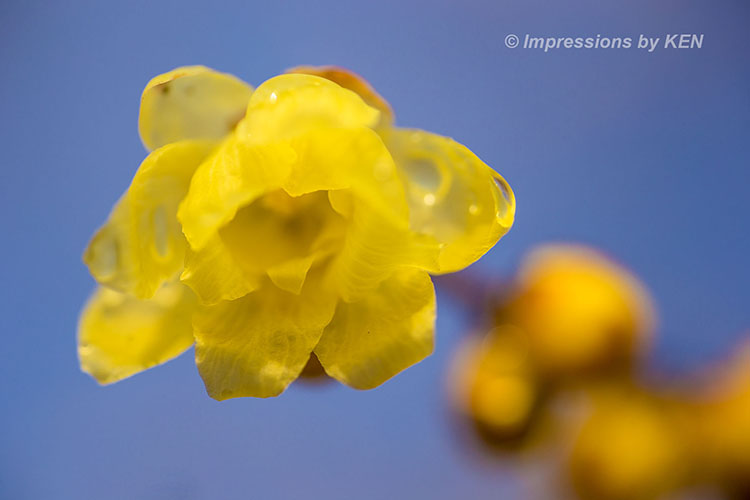 朝露を外して、逆光に輝くロウバイの花と、青空と、、