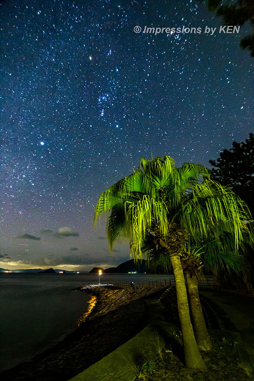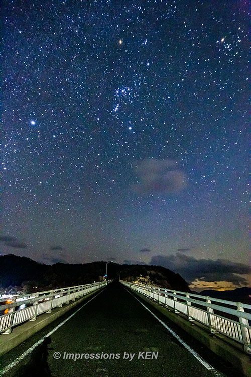 これはオマケの一枚。星のビーチからほど近い、沖家室大橋とオリオン。オリオンが丁度真正面に来る時間まで待って撮影しました。