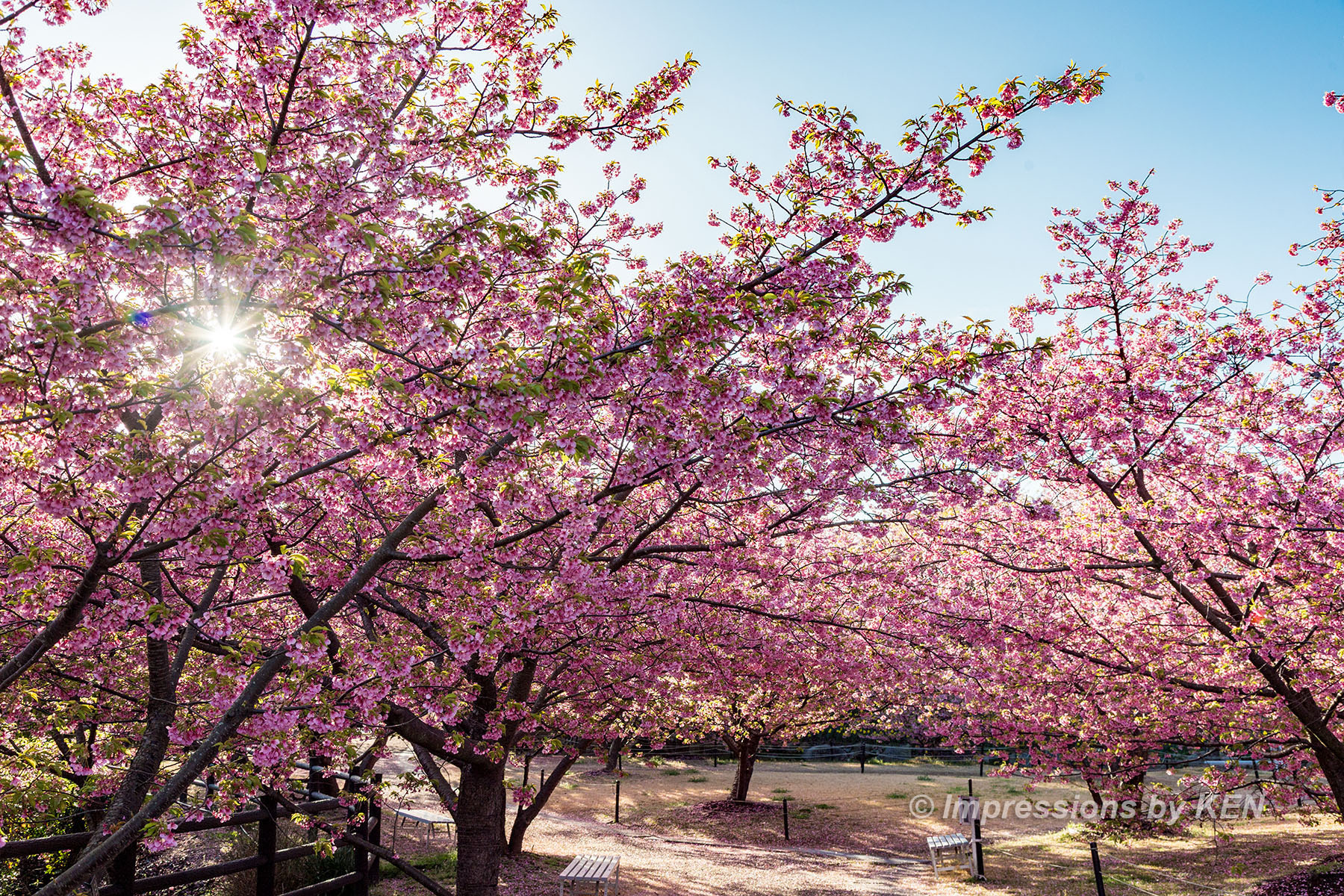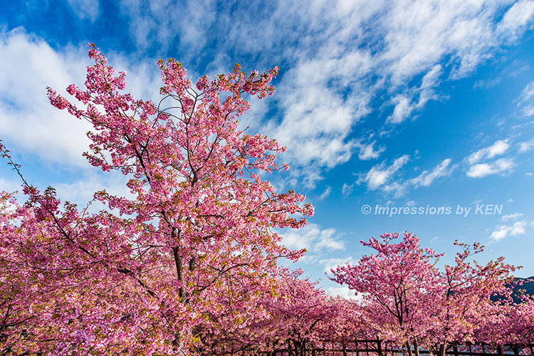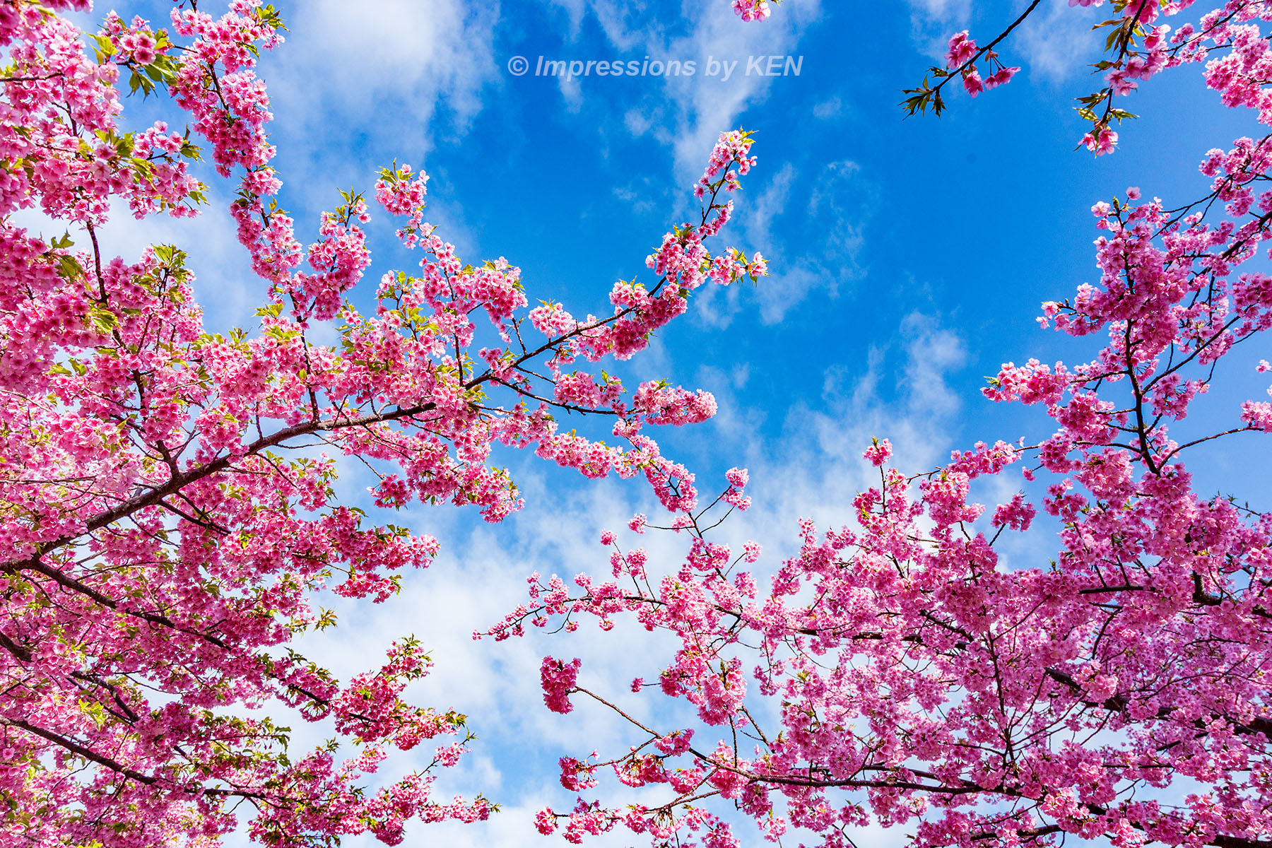 再び河津桜を主役に。見上げてみれば素敵な色のコラボ。