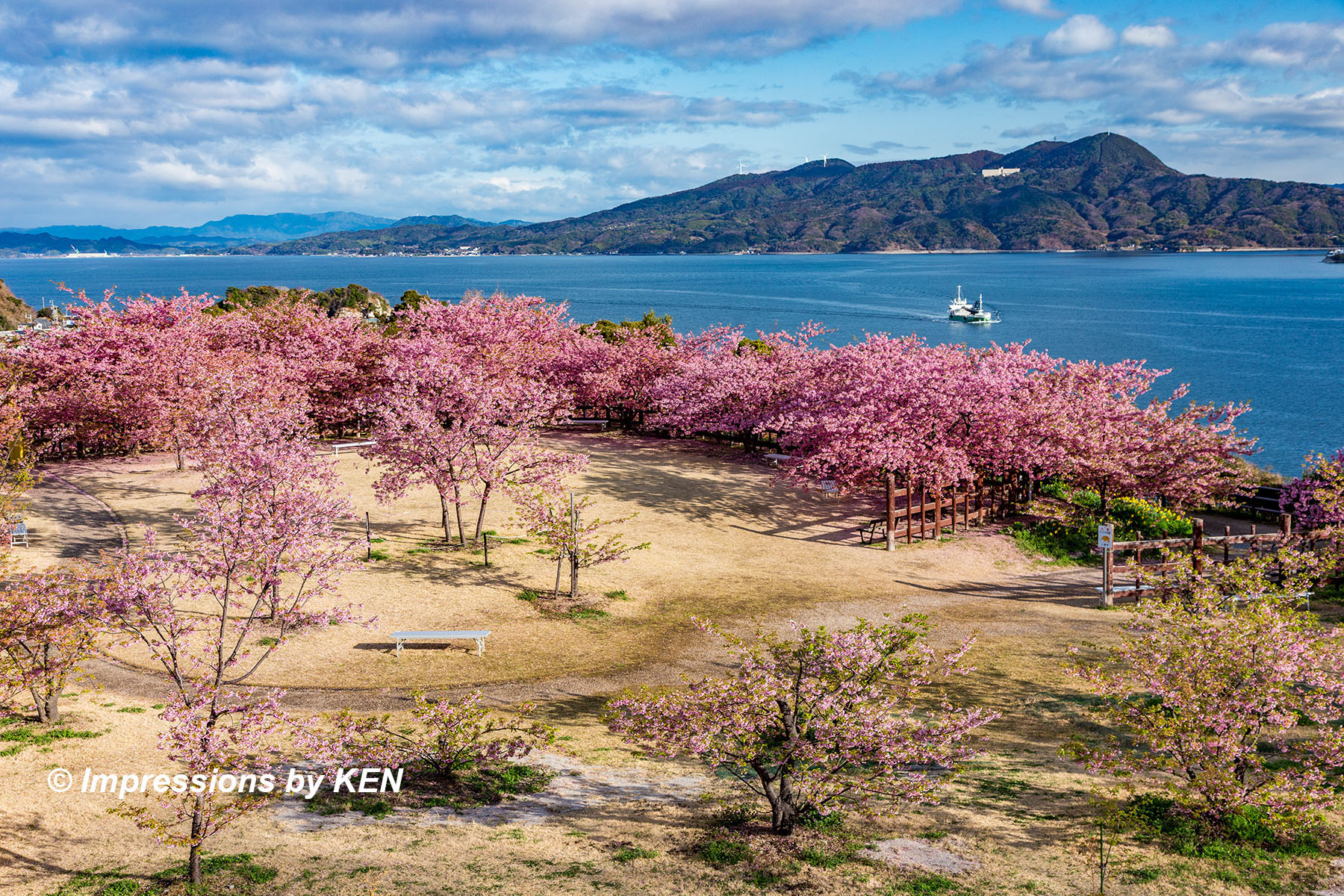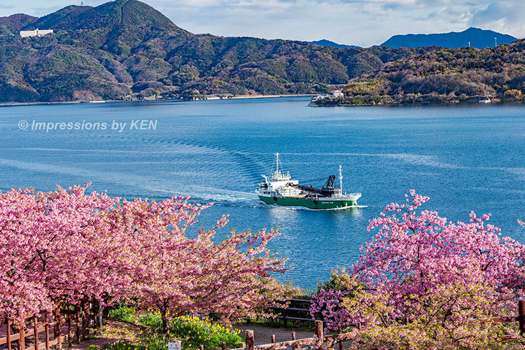 やってきた大型船と河津桜のコラボ。現代でも海上運輸の要衝である上関ならではの情景。