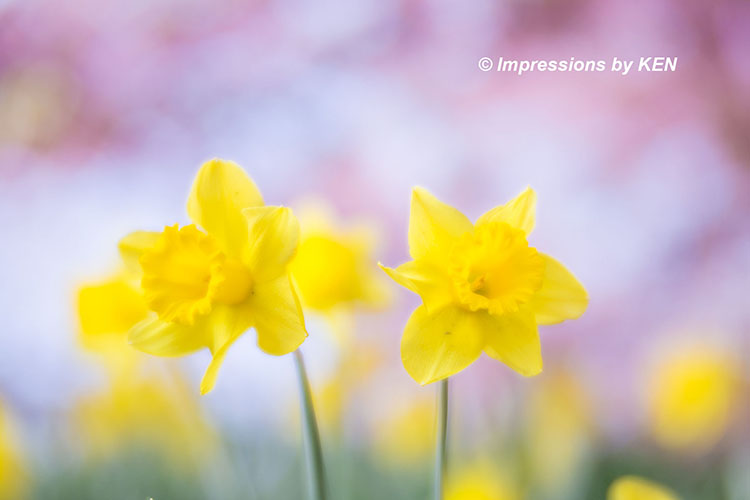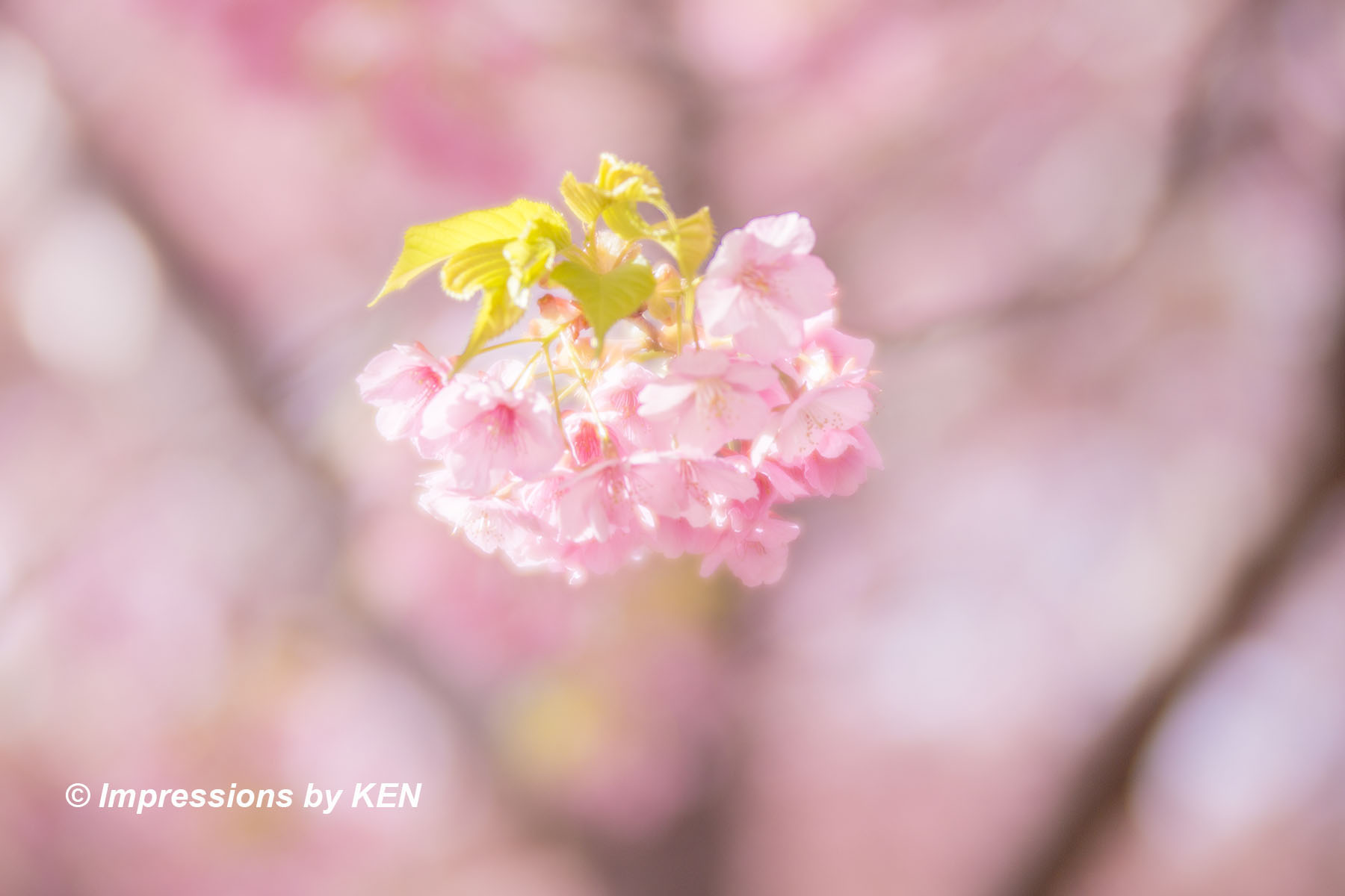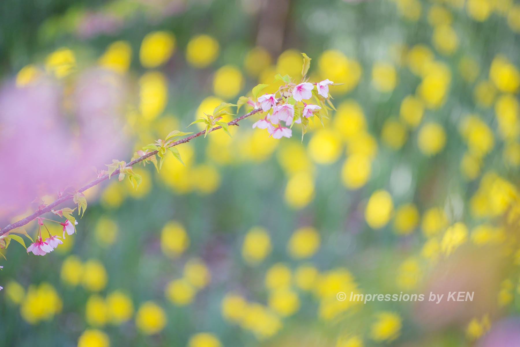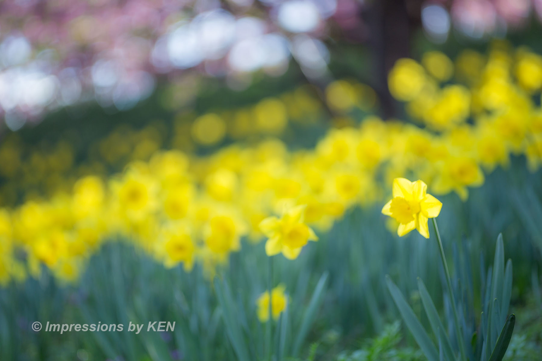 河津桜の飛び出た房を主役に、、でも背後の水仙のボケの方が主役っぽい(笑)