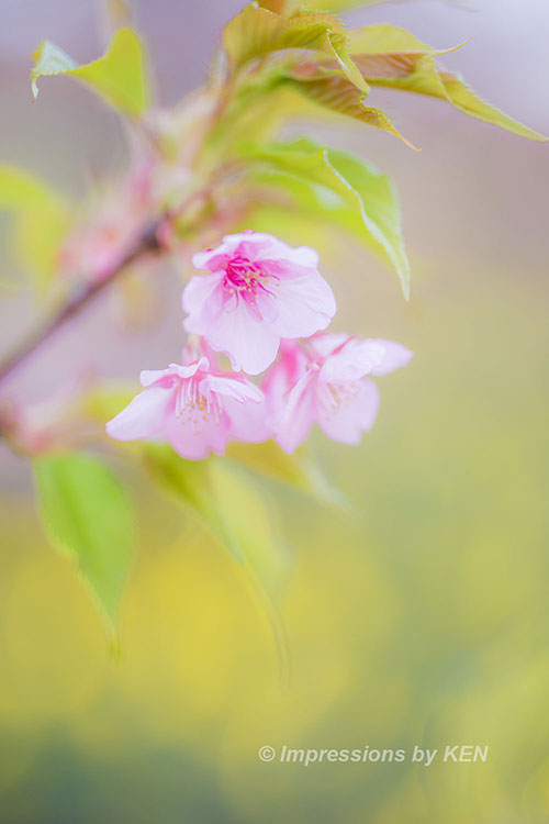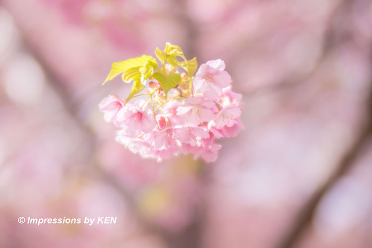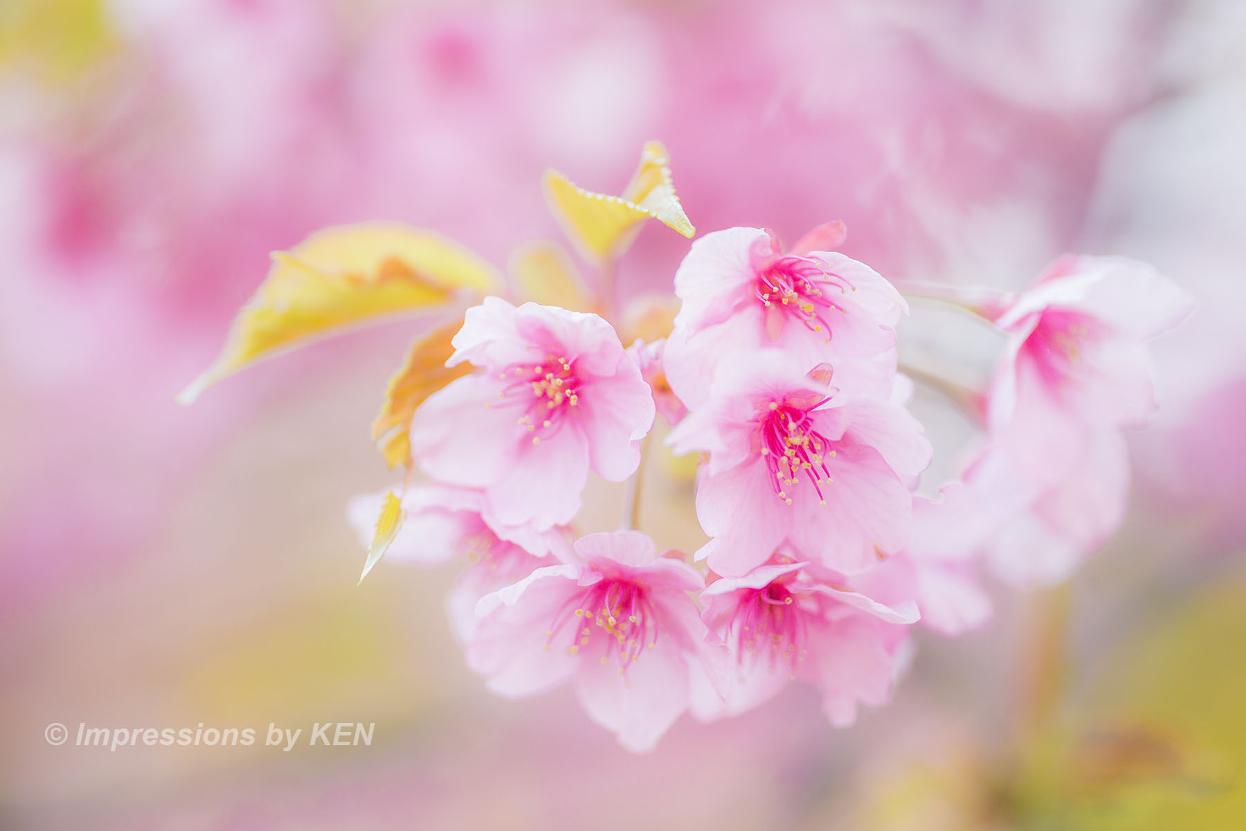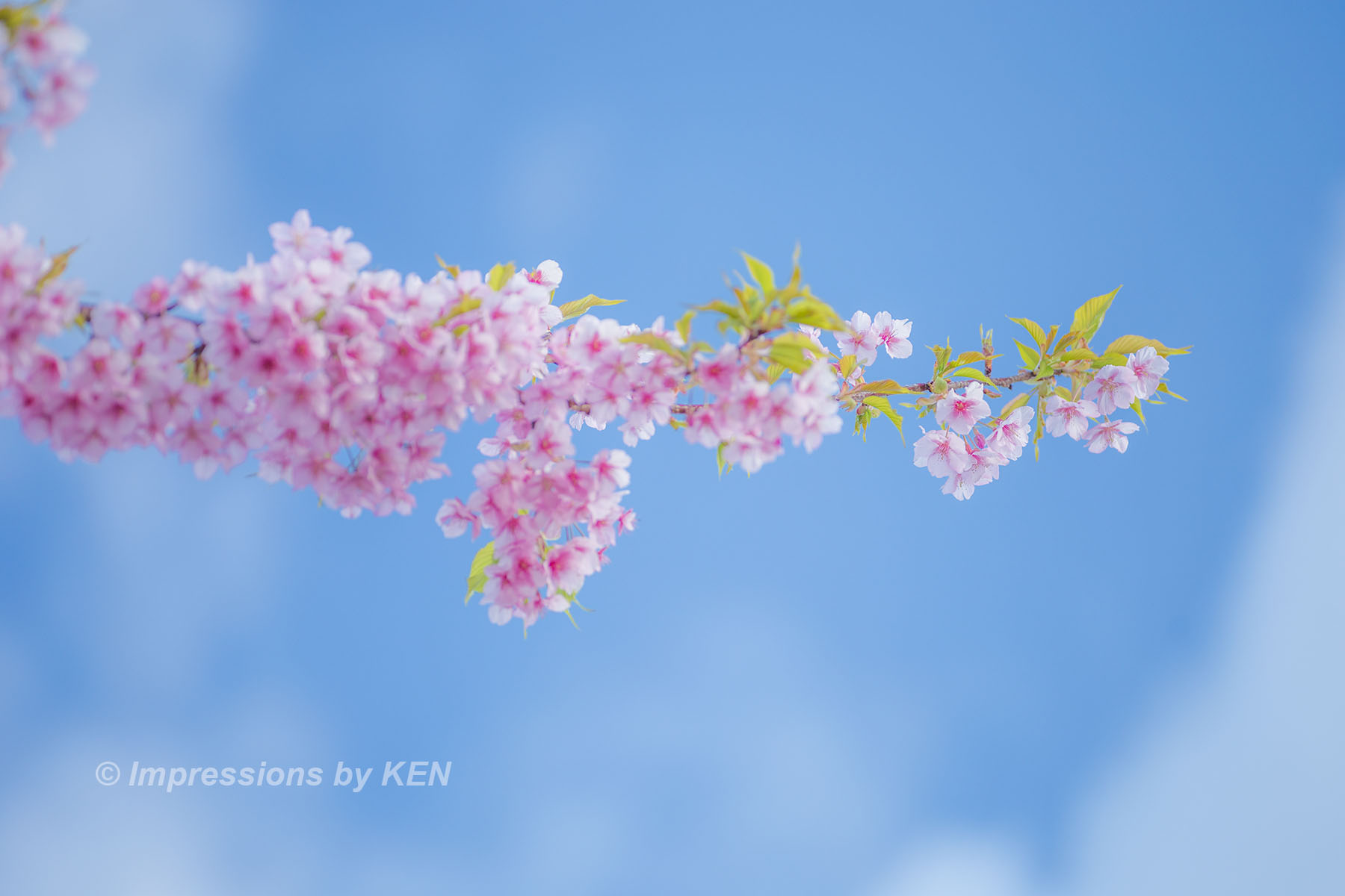 河津桜の房をアップで。背景整理にはいつも悩みますが、素敵な色の背景を恵んでくれる上関はいい場所です!