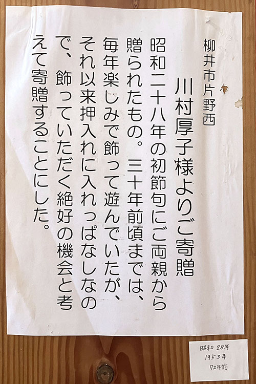 雛人形に添えられていた説明文。どこかの名工の作かと思いましたが、昭和28年に一般家庭で購入された人形だそうです。資料館の人にお伺いしたら、人形の着衣の作りからすれば、それほど高額な人形ではなさそうとのことでした。しかし、この人形作者がお顔や髪型の流行や作法にとらわれず、自分の美学を人形に取り入れたことが、リアルな官女を生んだと思います。
