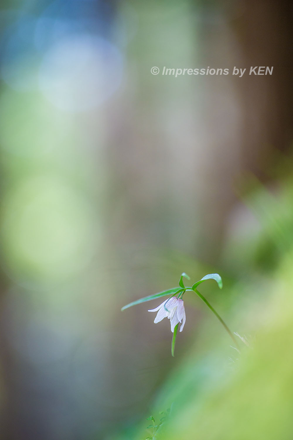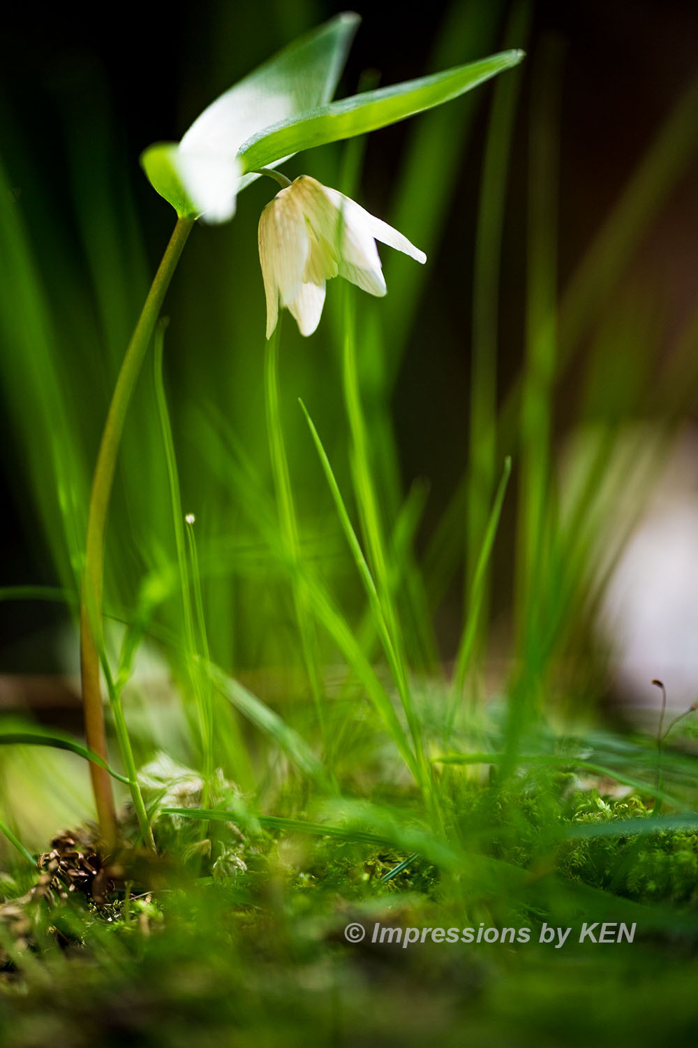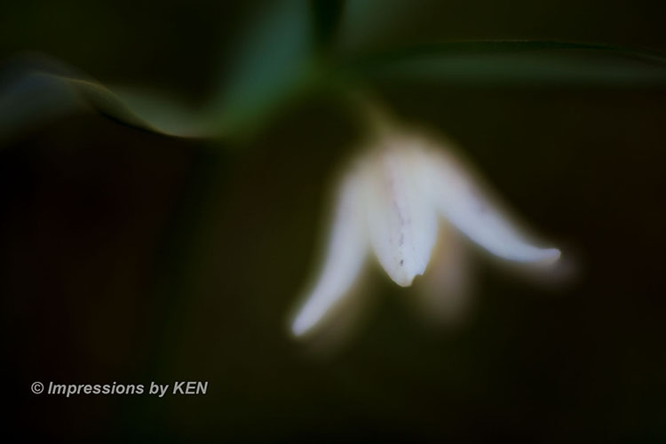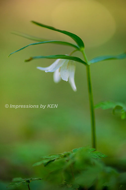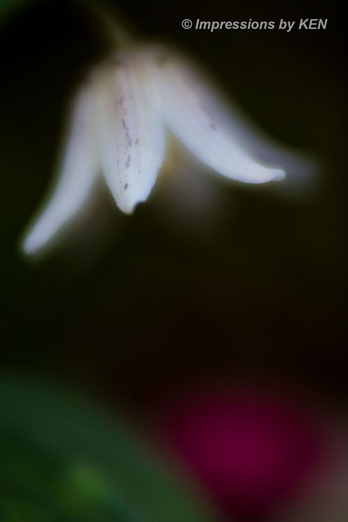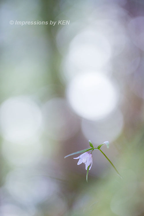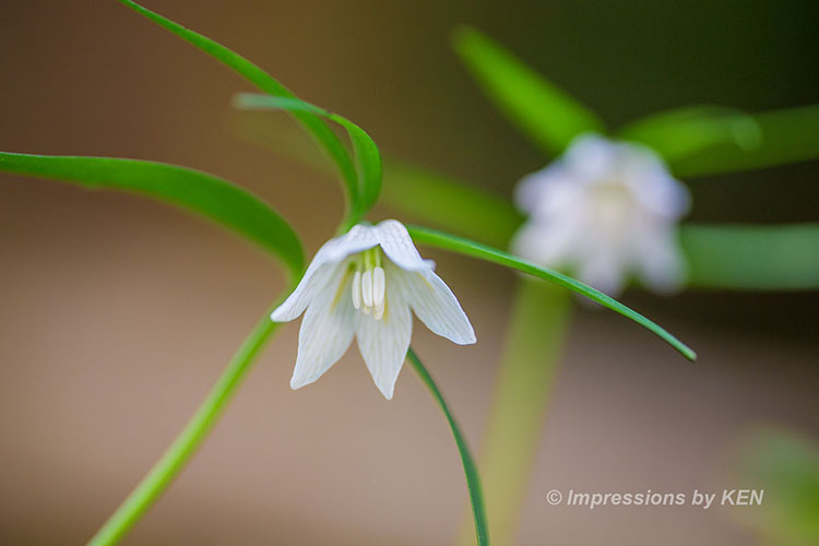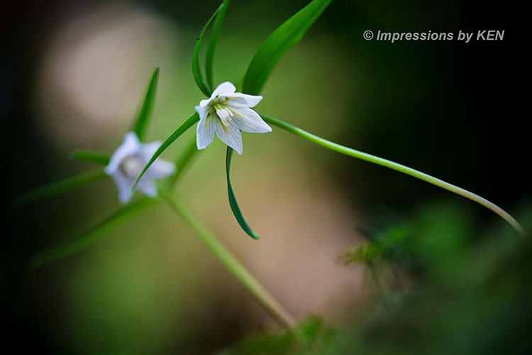 ここからは、イズモコバイモの表情を追いかけて何枚か。このカットは風に髪をなびかせている少女の様な雰囲気の花の形がお気に入り。何故か背景のボケも風になびいたかのように楕円形です。