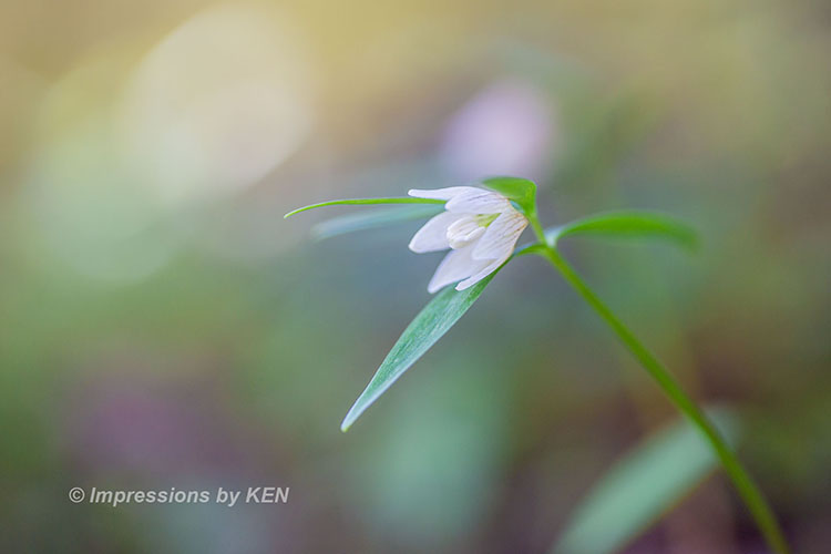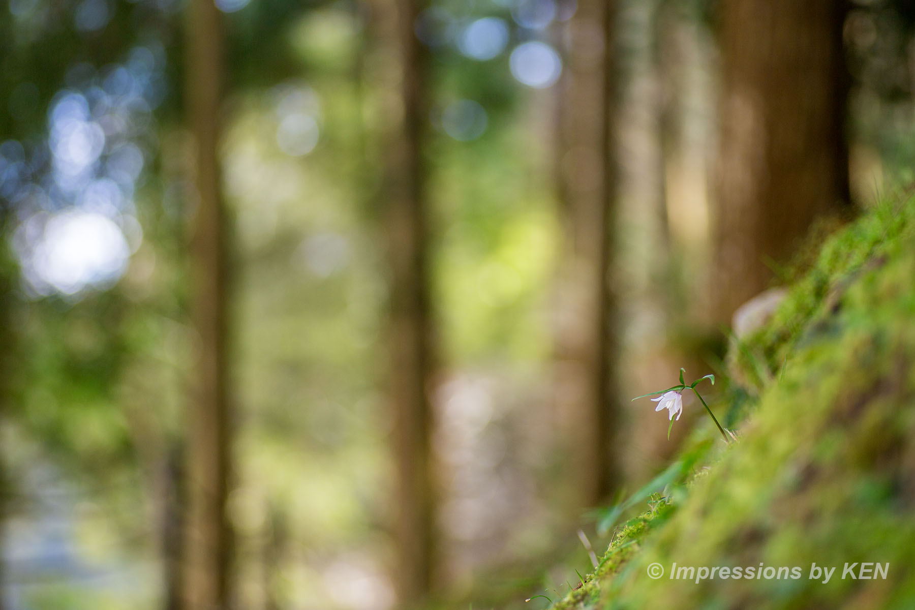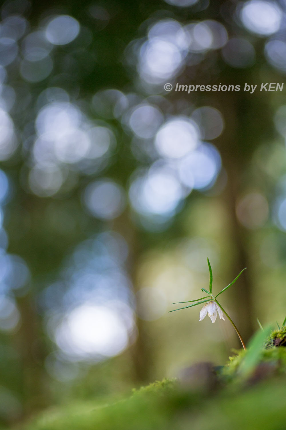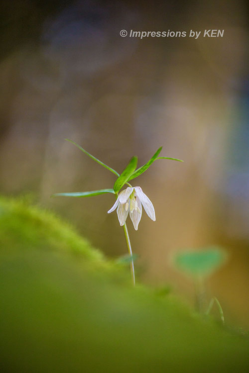 先ずはイズモコバイモが咲く林の情景が分かるカット。レンズはマクロの定番タムキューです。マクロアポランターの125mmよりも短焦点な90mmのタムキューは、背景の様子が分かる描写をしてくれました。