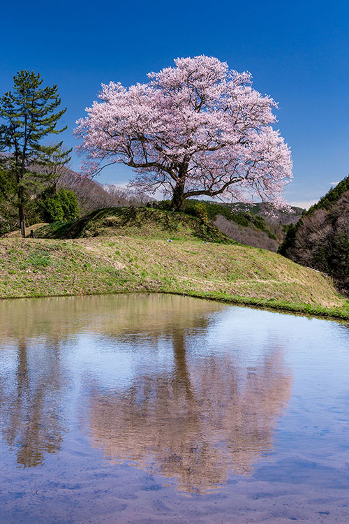 先ずは昼間の写真から。定番の田圃リフレのカットです。この日(4月7日)は全国的に強風が吹き荒れて千葉県でタンカーが風に流されて座礁していましたが、神石高原町も例外ではなく強風ビュービュー。田圃の水面には細波が出来てリフレがなかなか表れませんでした。これはかなり待って、やっと水面に桜の姿が現れた時の写真。桜のリフレがぼやけていますが、この日はこれが限界。