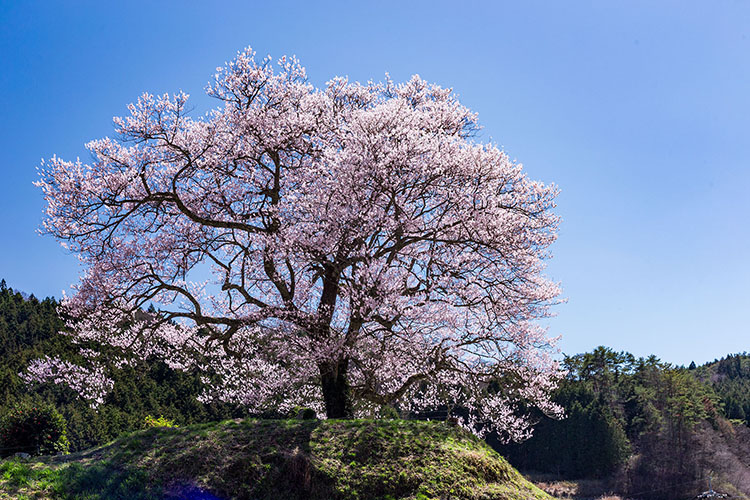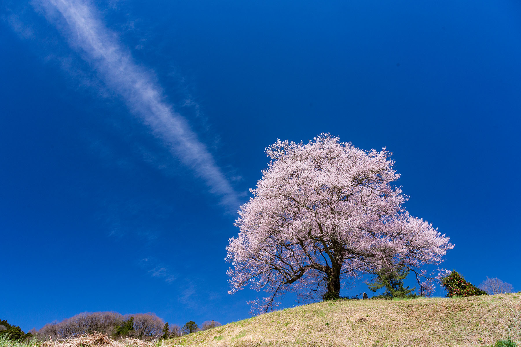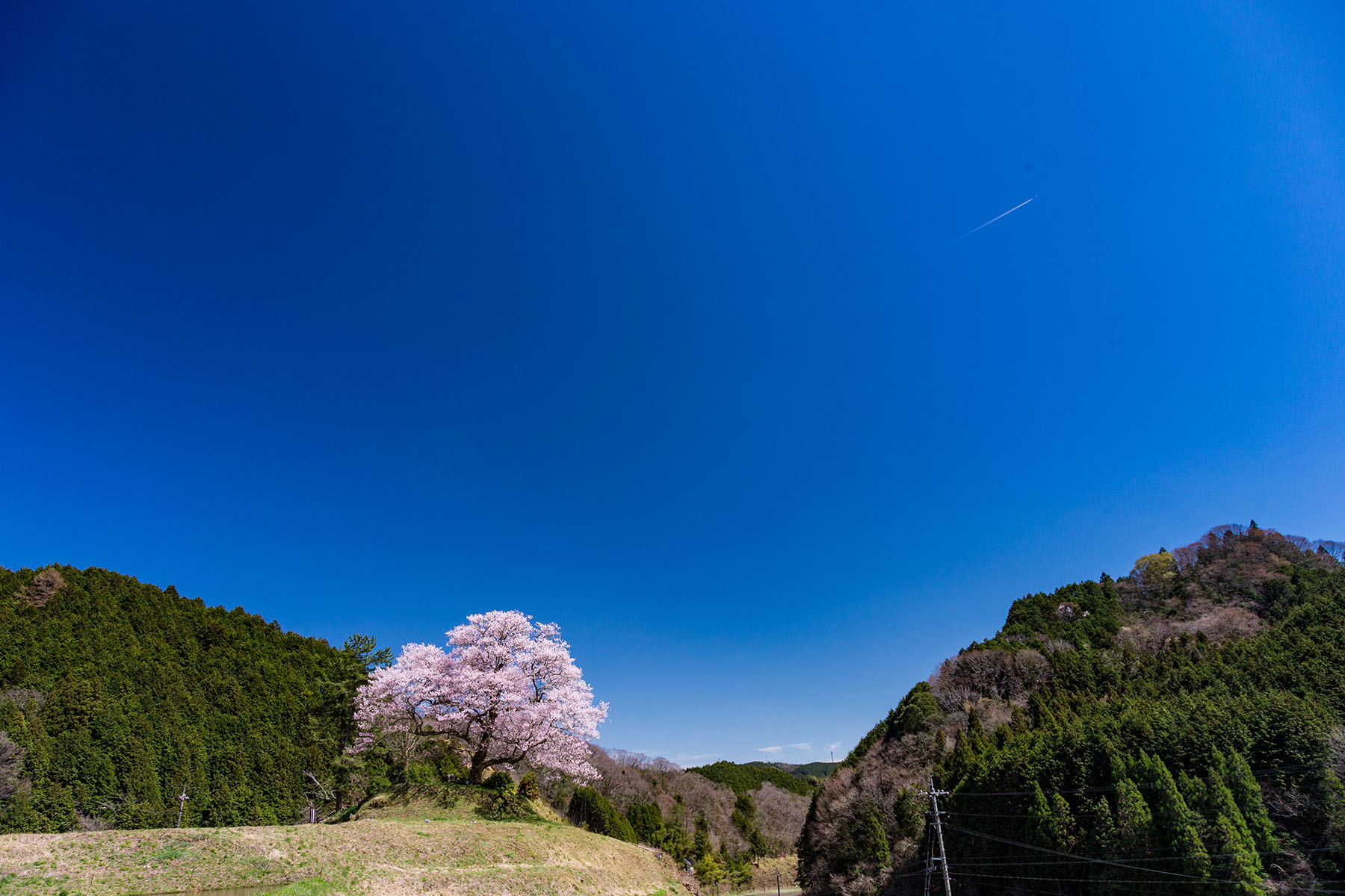ポジションを桜の東側に移して、午後の逆光に輝くエドヒガン。田圃リフレのポジションからだと右に傾いて咲くエドヒガンですが、他の場所からだと形と印象が変わります。