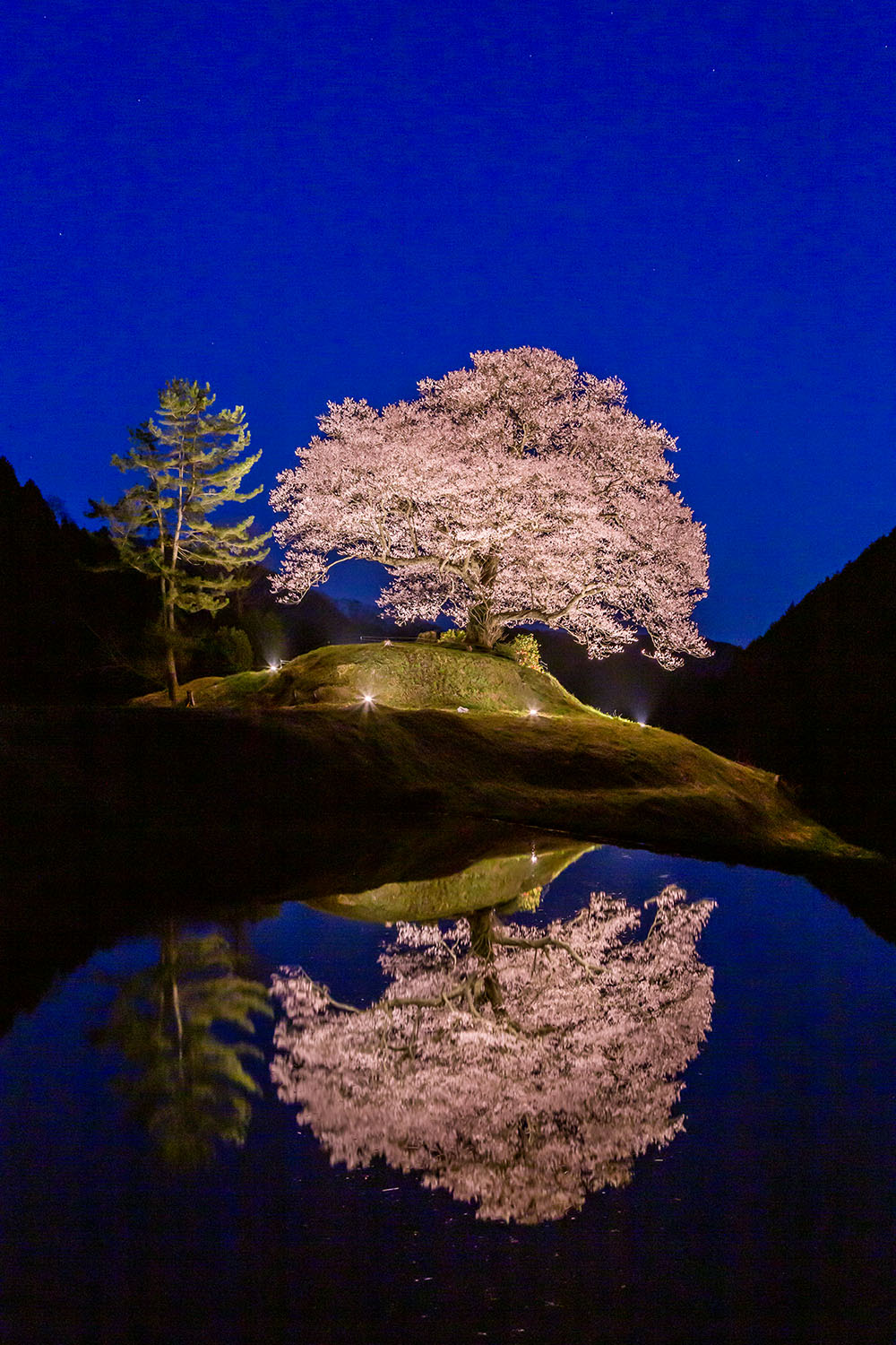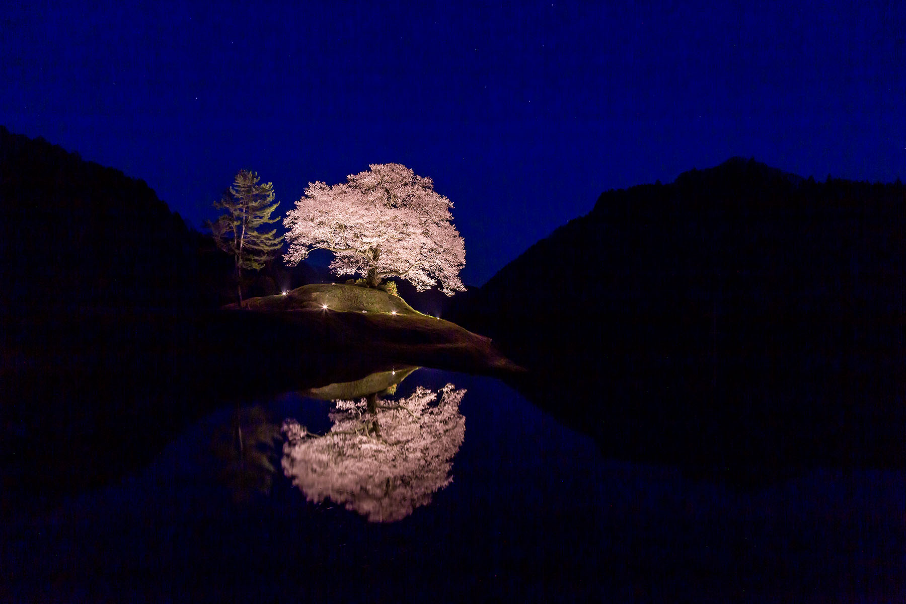 ここからは夜のライトアップの写真。夜には風が穏やかになり、綺麗なリフレを堪能することが出来ました。撮影日に月は無く、薄明が終わると空は真っ暗。この写真はライトアップが始まった直後の、空にまだ少し明るさが残っていた時間のカット。空がレイリーブルーに輝き、いい感じの写真になりました。