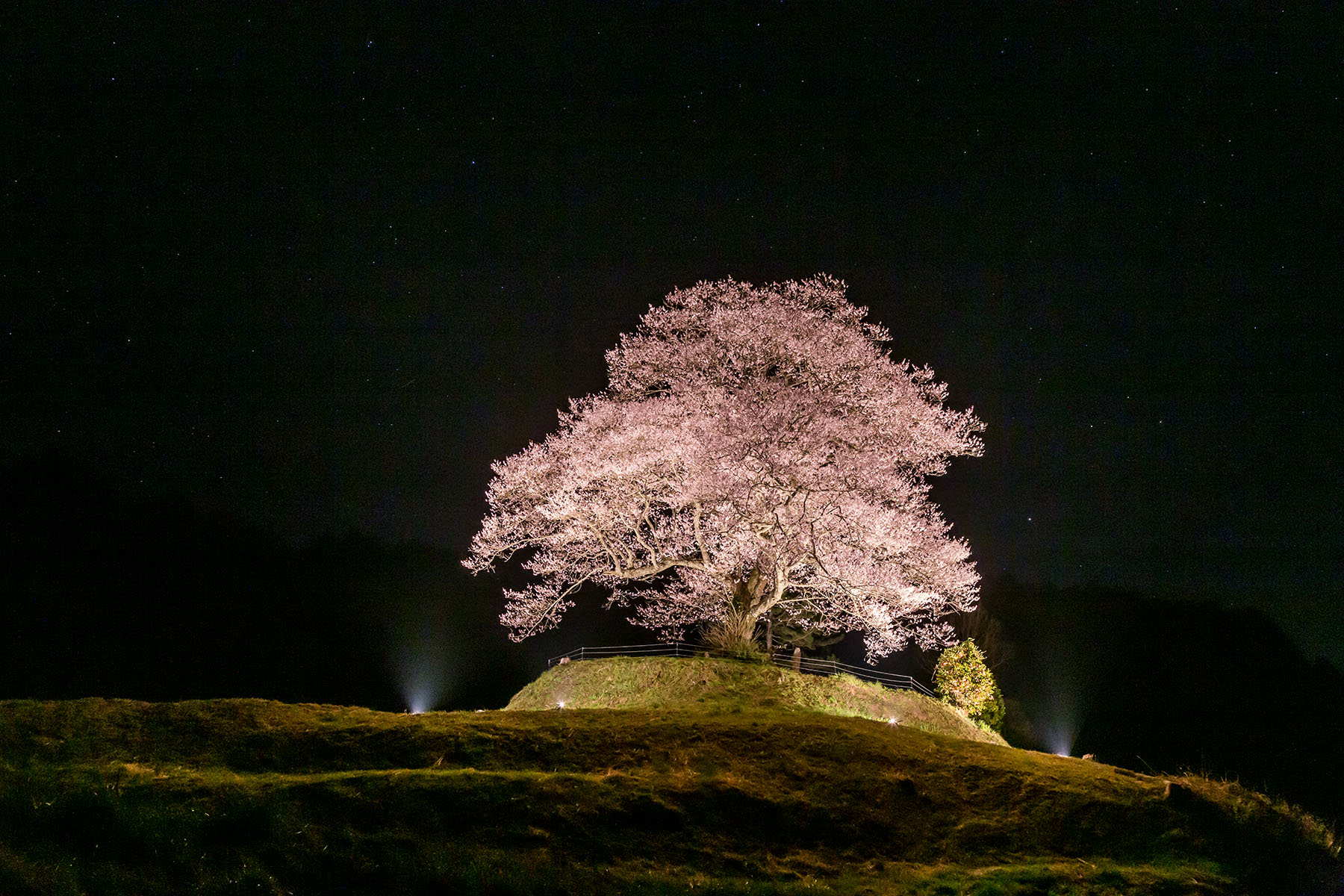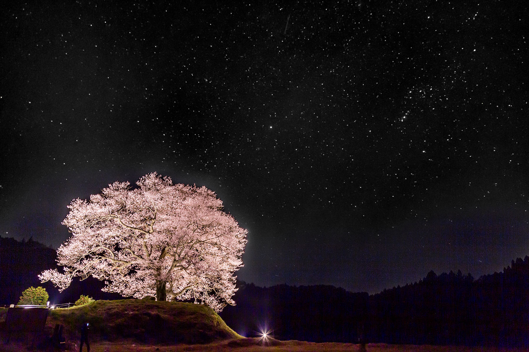 その第一弾は広島県神石郡神石高原町にある神宮寺跡のエドヒガンです。毎年通っている桜で、本サイトでは2021年の初登場以来、6年連続6回目の登場となります。今年は青空に恵まれたものの、夜には月がなくアクセントに欠ける情景となりましたが、代わりにオリオンと組み合わせた写真を撮ってみました。撮影日は2026年4月7日です。