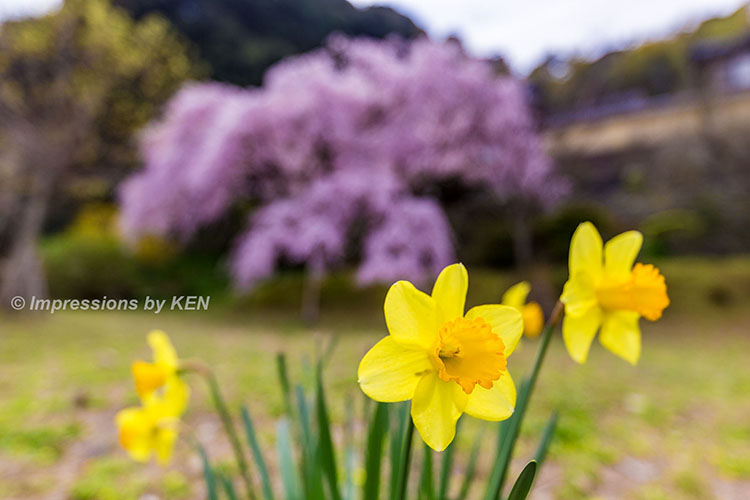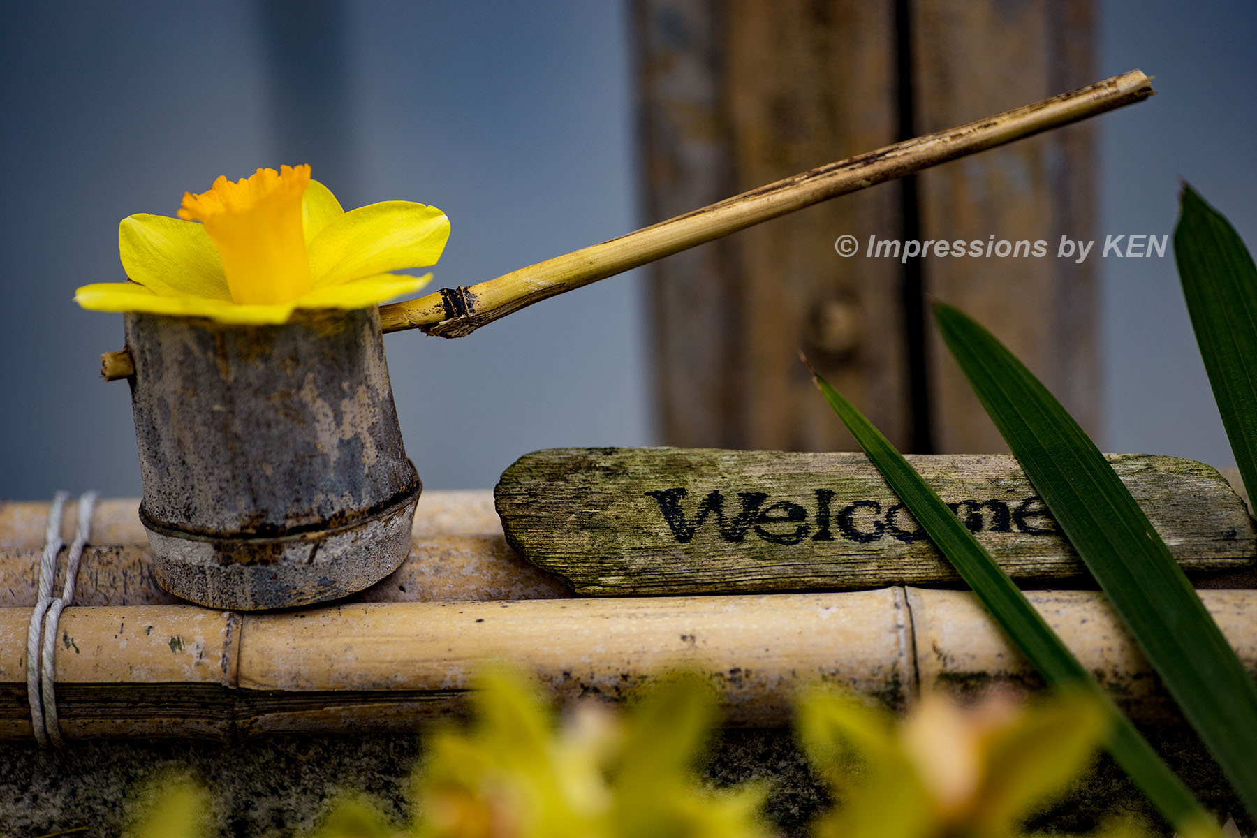 そして、先程の黄色い水仙と、Welcomeの文字。本記事のタイトルにある「おもてなしの花寺」は私が勝手に付けたものですが、このお花たちを見ると、その呼称がふさわしいと思いました。