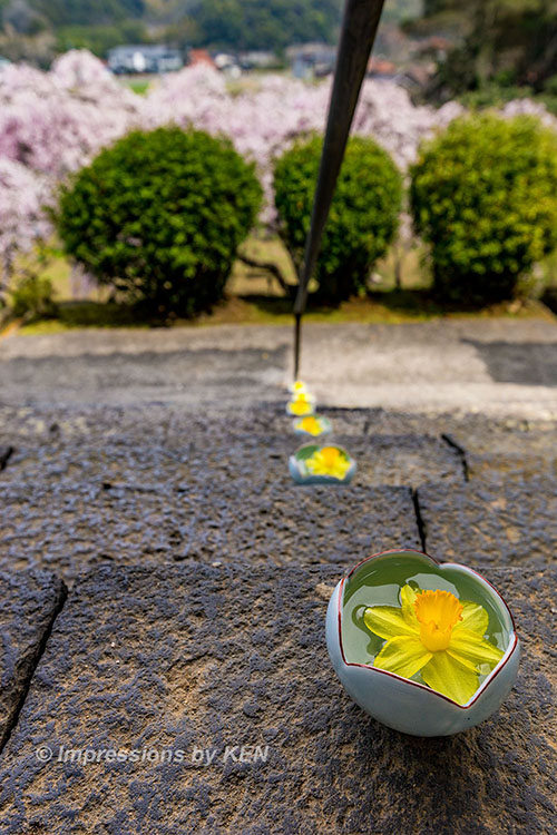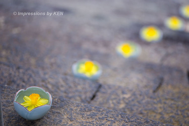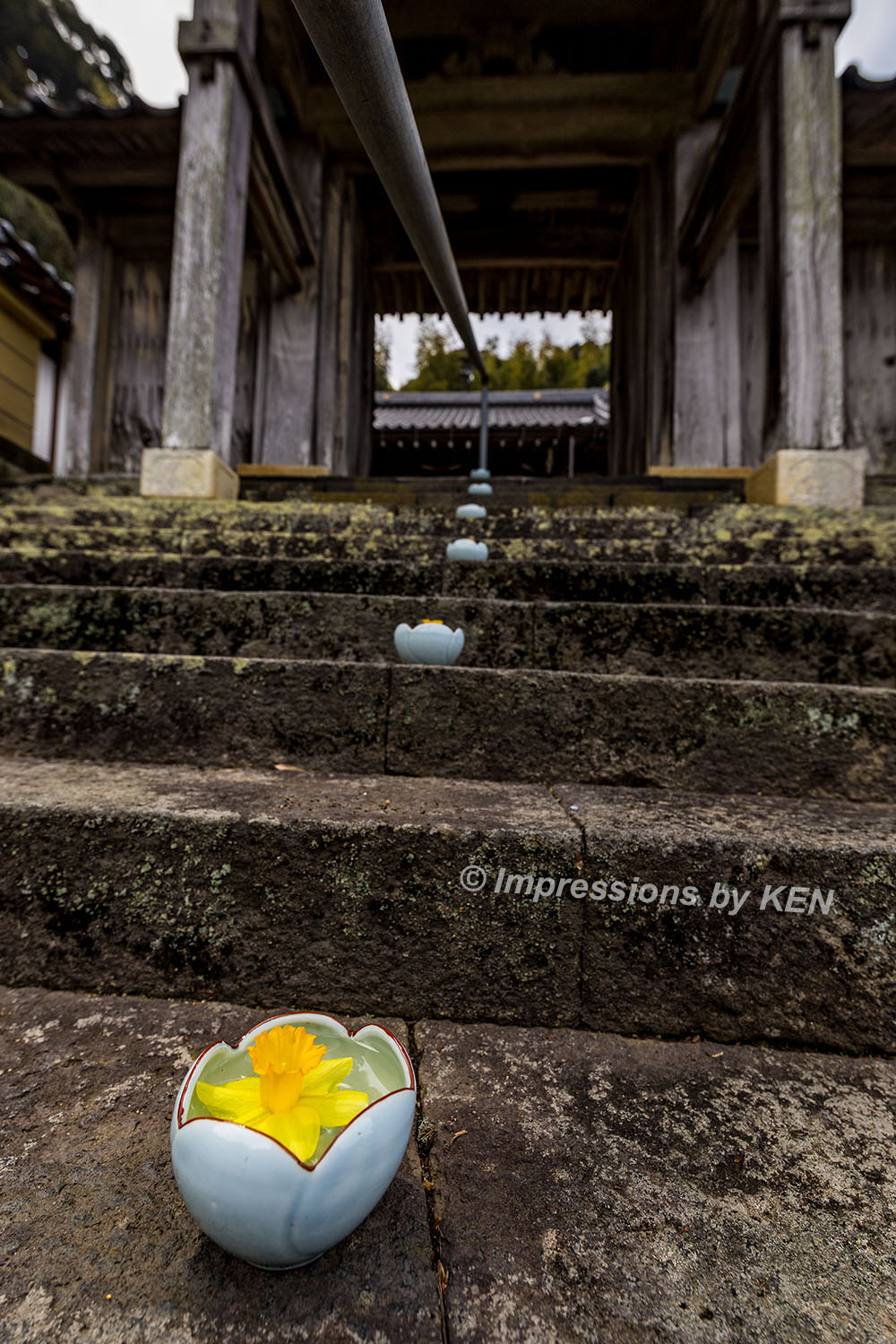 撮影しながら山門のところに行ったら、階段のところに黄色い水仙が湯呑の様な器に生けられて並べられていました。