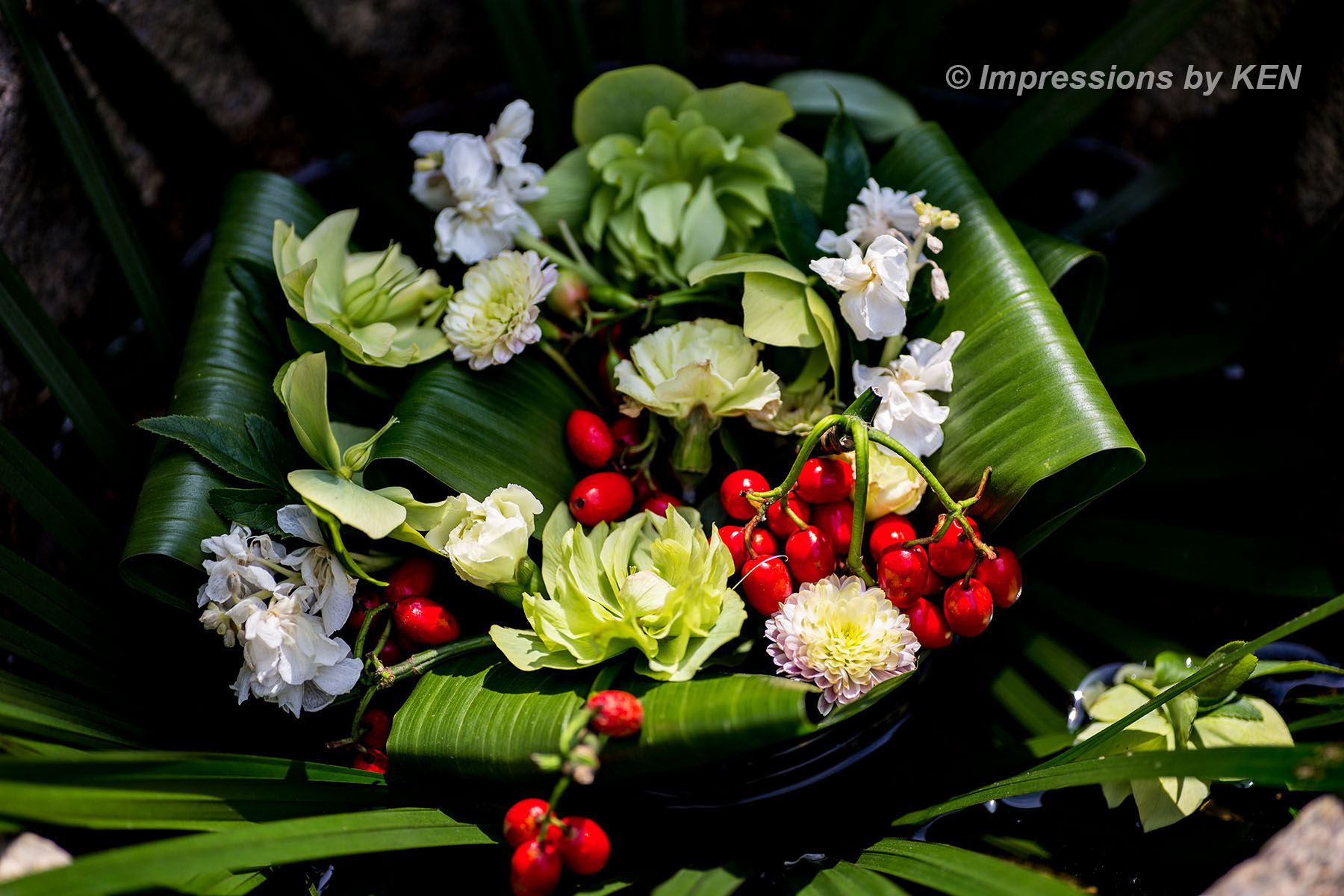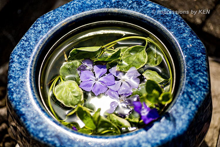 境内に入ると水鉢が幾つか置かれていて、その中にもお花の芸術がありました。