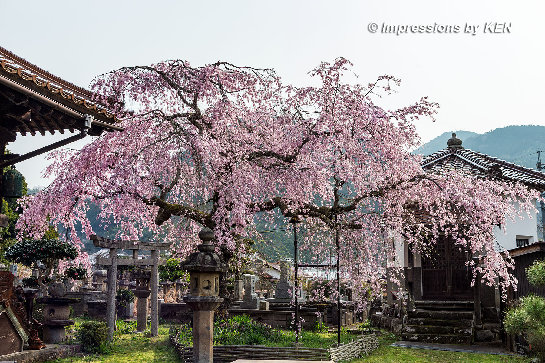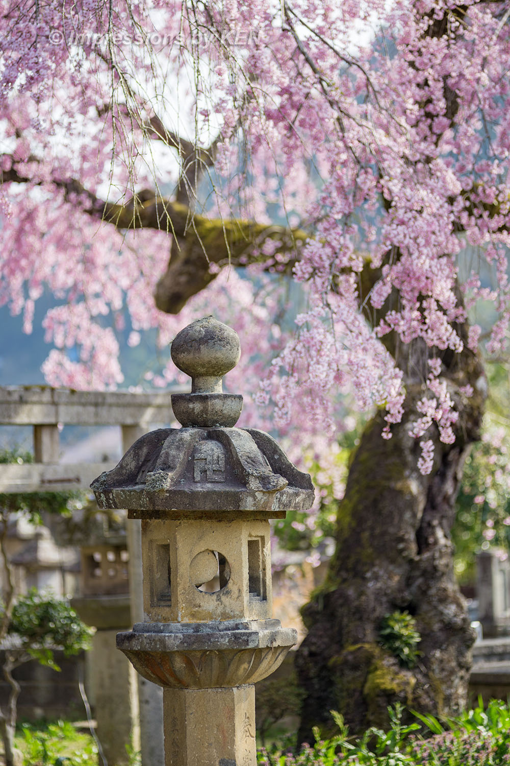 本堂脇に咲いていた満開の枝垂れ桜。周囲には鳥居、灯籠、白壁の建物、お墓、電線が所狭しとあり、整理された構図で撮ろうとすると難易度の高い被写体でした。