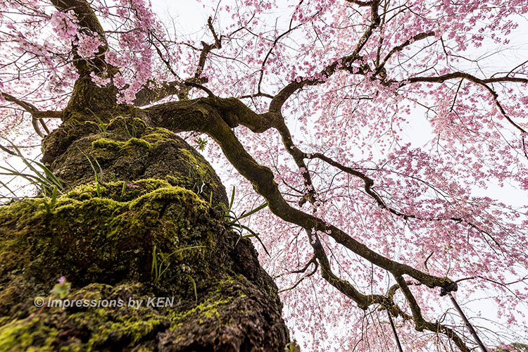 最後は枝垂れ桜を下から見上げて。晴れていればもっと良かった。