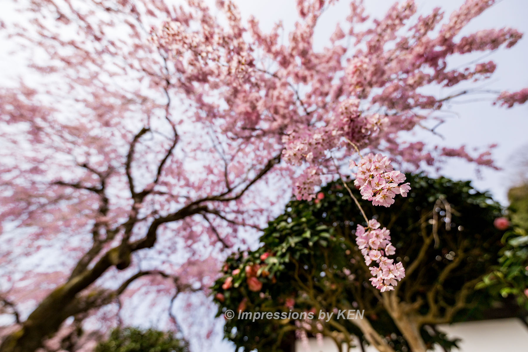 周囲の物を全てカットしようと試行錯誤したら、この構図(笑)。苔むした幹は風格があります。青空だともっと映えたと思いますが、白バックは襖絵の様で「和」の雰囲気が出ました。濃いピンクの花なので、曇り空でも花の存在感が失われず良かったです。
