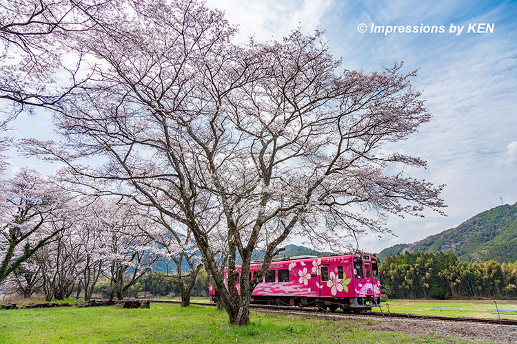 六日市から岩国に通じる国道187号は錦川清流線と並行して走り、沿線は桜が満開。という事で根笠駅と南河内駅で桜と列車を撮影してみました。