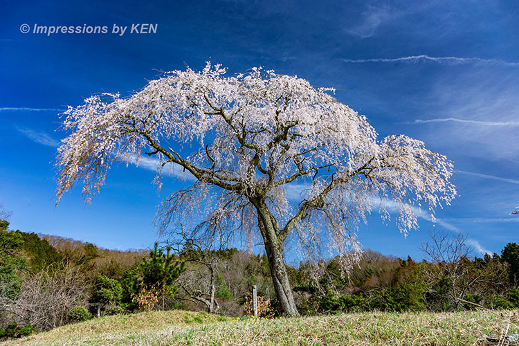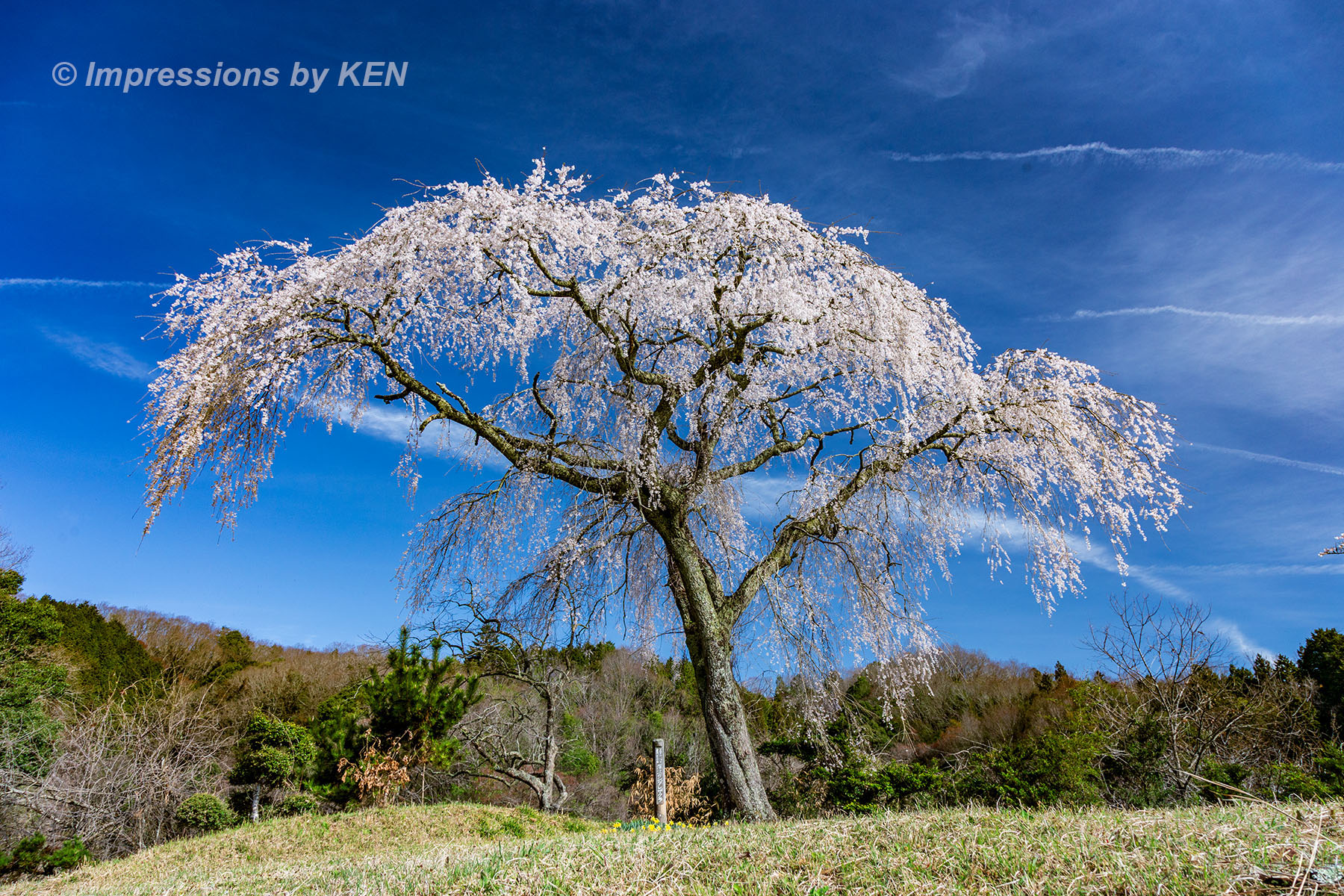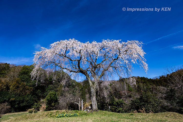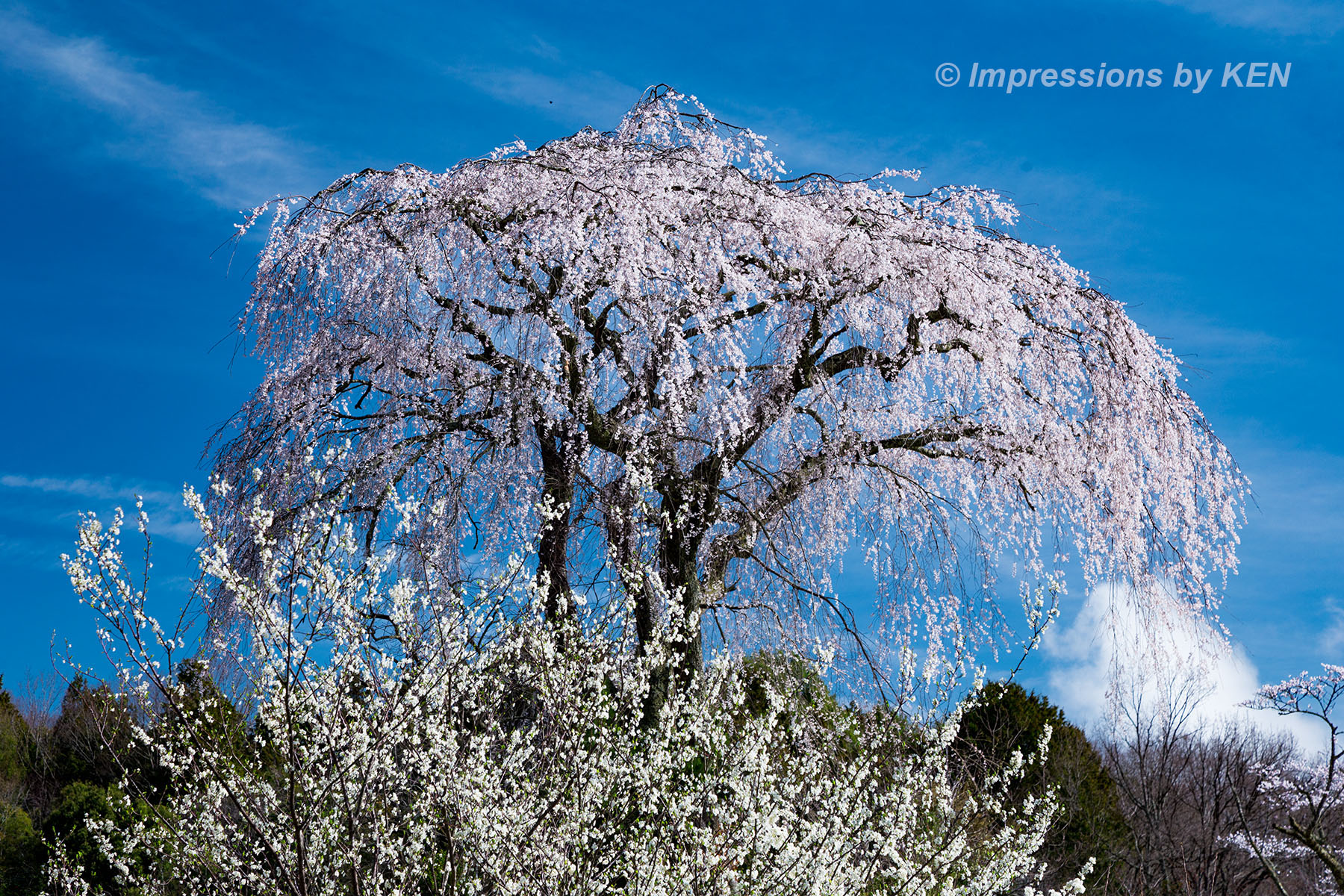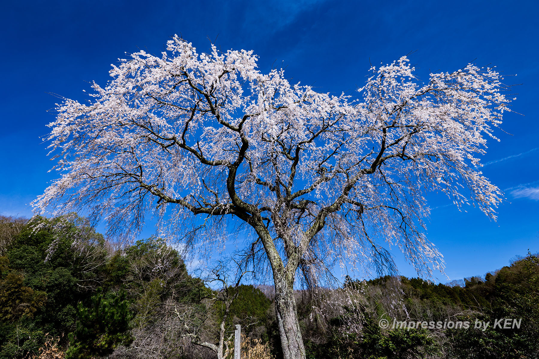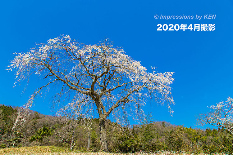 広島県府中市上下町にある「深江の枝垂れ桜」の写真です。殆ど知られていない桜で、開花情報などは全く無し。過去何度か訪問していますが美しい姿に巡り合うのが難しい被写体です。このサイトでは2020年4月以来6年ぶり2度目の登場。2020年の時には既にかなり散っていて、満開ではない姿でしたが、今年は満開の姿を初めて拝むことが出来ました。青空にも恵まれて会心の作品が撮れたと思います。撮影日は2026年4月5日です。