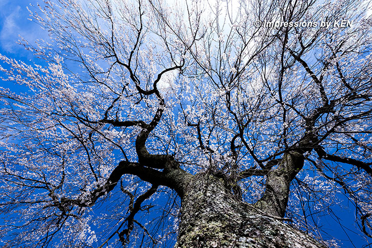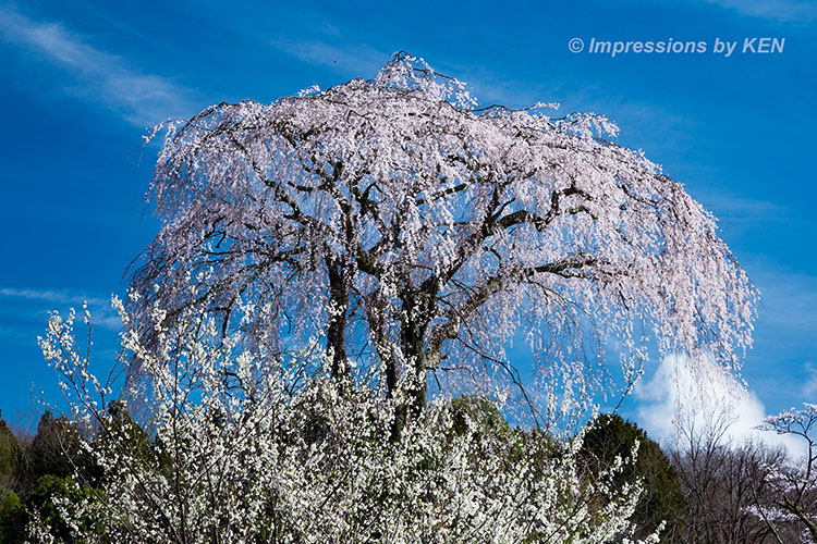 2020年の画像を引っ張り出すと、左下に伸びていた枝垂れが無くなっているのと、中央下部の枝垂れが枯れたのか、花つきが悪くなっていますね。ネット上にはもっと優美に360度ぐるりと長い枝垂れを垂らした写真もあり、樹勢に陰りが見えているのかも知れません。