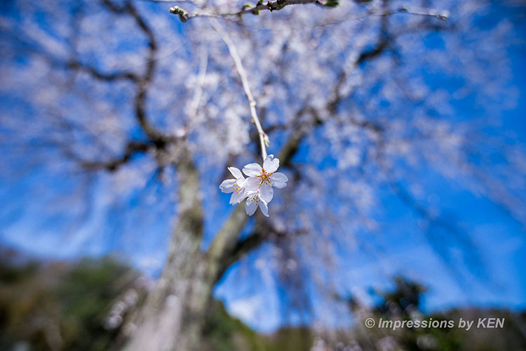 更にもう一枚、数輪の花を主役に、枝垂れ桜全体の雰囲気を感じられる構図で。